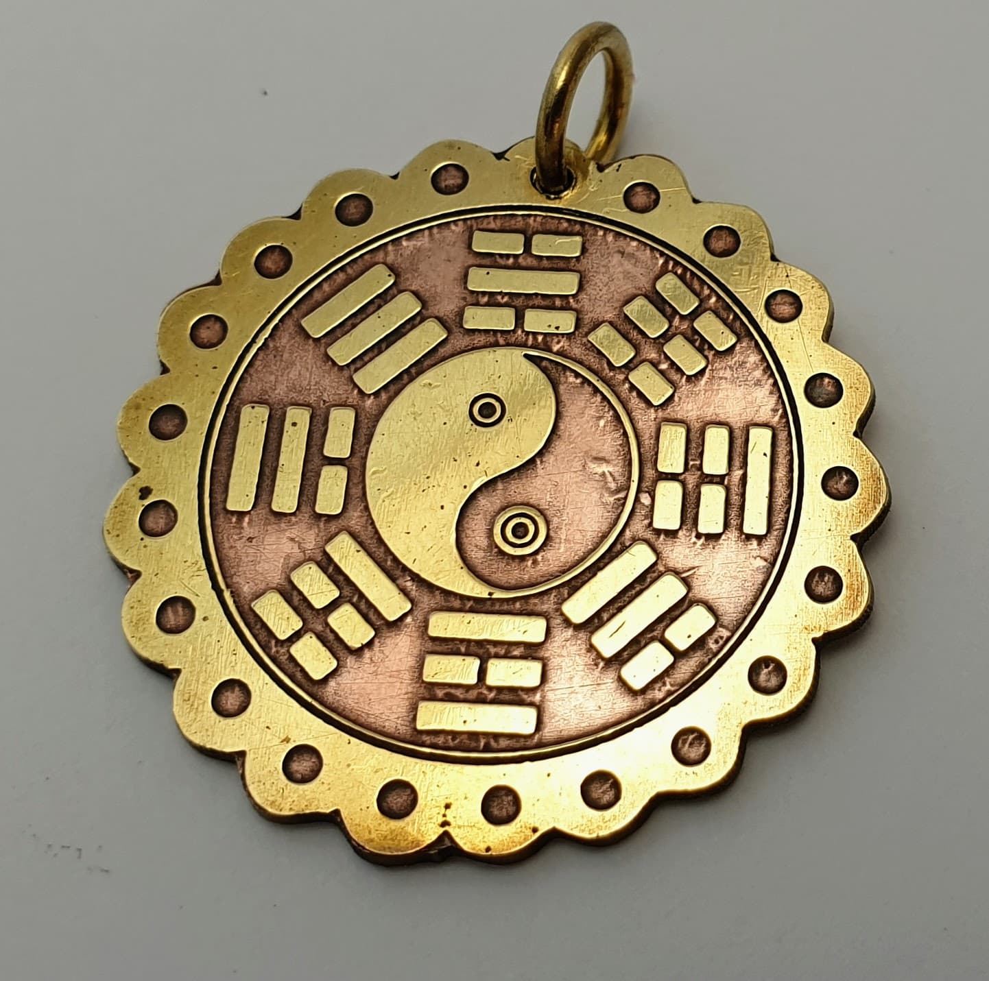 Ręcznie trawiony w mosiądzu amulet Yin-Yang z ośmioma triagramami I-Cing. Talizman ochronny i symbol starożytnej mądrości.