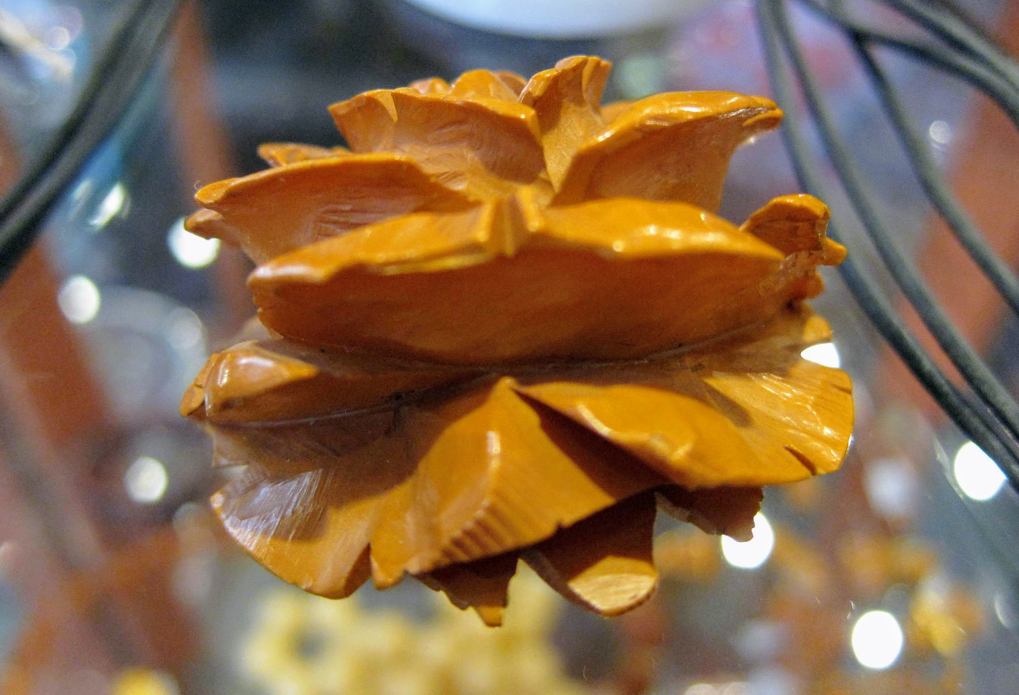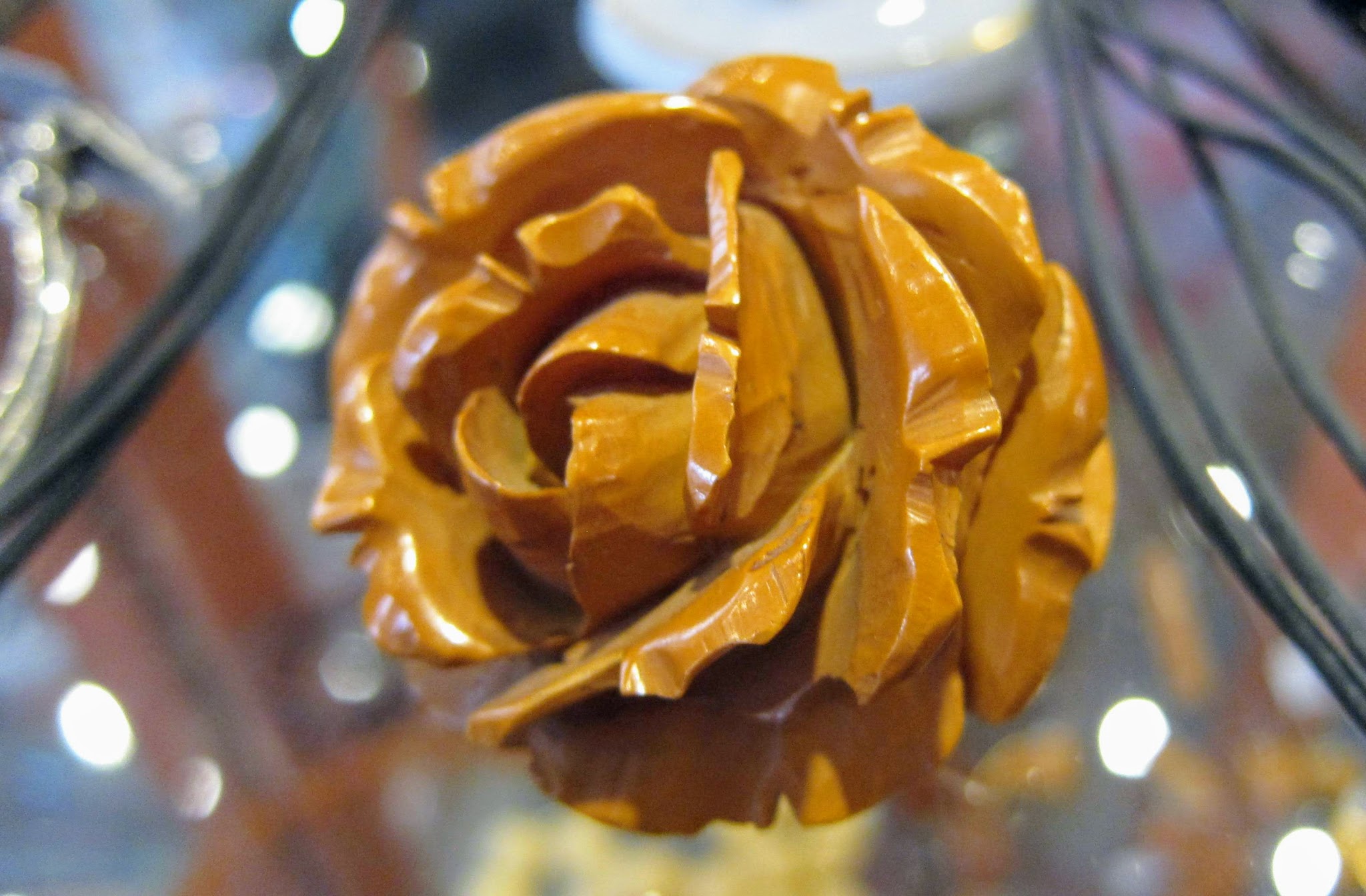 XIX-wieczna broszka z bakelitu w formie ręcznie rzeźbionej róży. Imitacja bursztynu. Unikatowy przykład niemieckiego rzemiosła z Królewca. Wielkość ok. 5 cm.