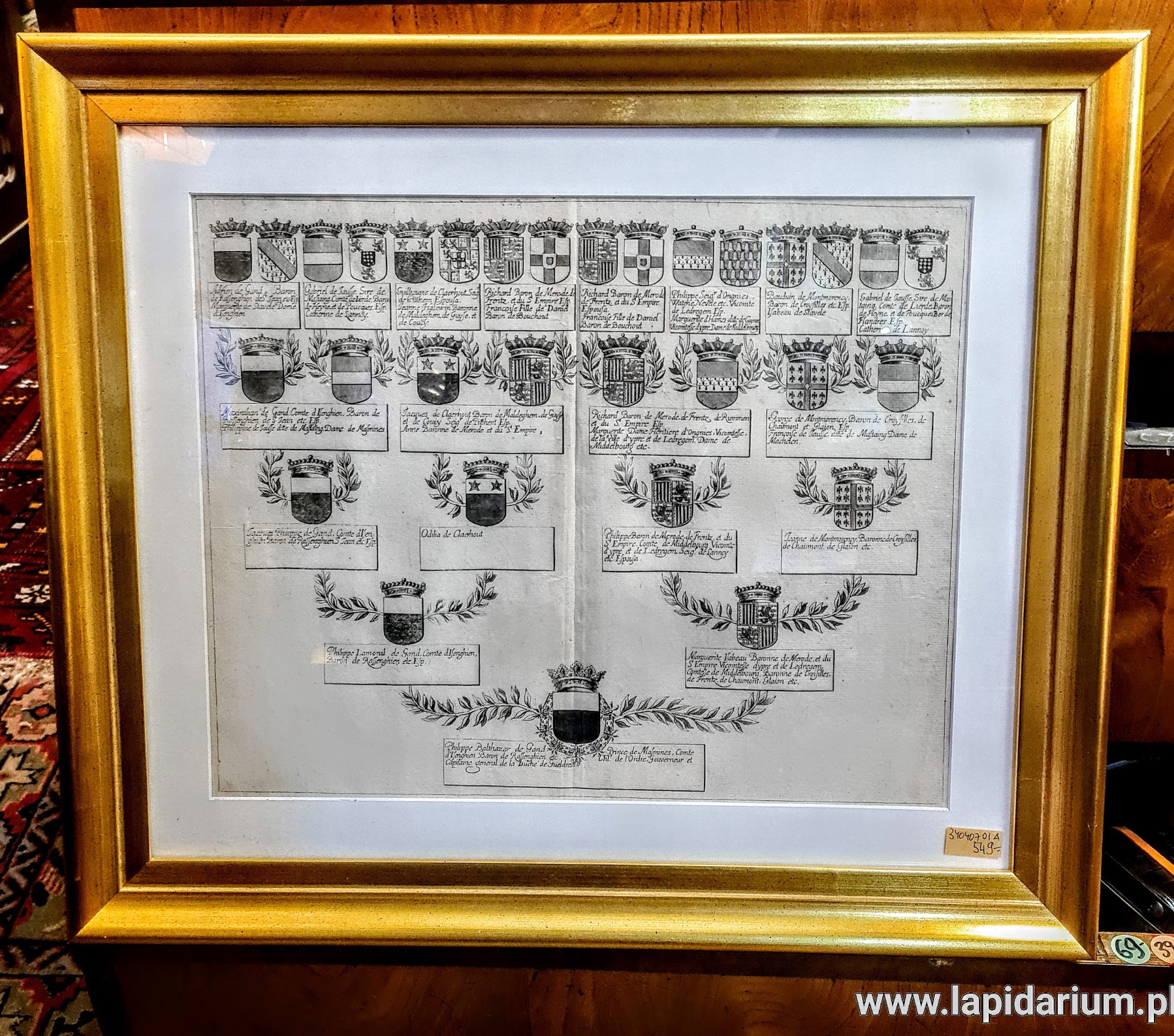 Autentyczne drzewo genealogiczne z Europy Zachodniej – miedzioryt na papierze czerpanym, oprawiony w nową drewnianą ramę pod szkłem. Unikatowy przedmiot kolekcjonerski.