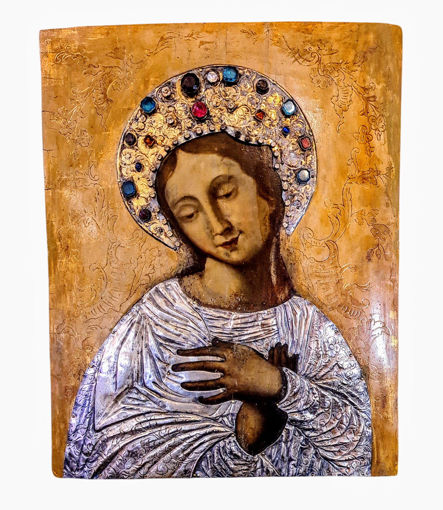 Duża , XIX-wieczna ikona małopolska w stylu włoskiego renesansu. Tempera na desce, unikatowe połączenie sztuki sakralnej. Koszulki metalowe posrebrzane ze śladami złocenia . Kamienie półszlachetne – ametysty, kryształy górskie i inne . Tło ze śladami złocenia . Deska ze szpongami pomalowana od tyłu aby sie nie odkształcała . Widoczne niewielkie uzupełnienia i reperacje . Ogólnie stan dobry bez korników .