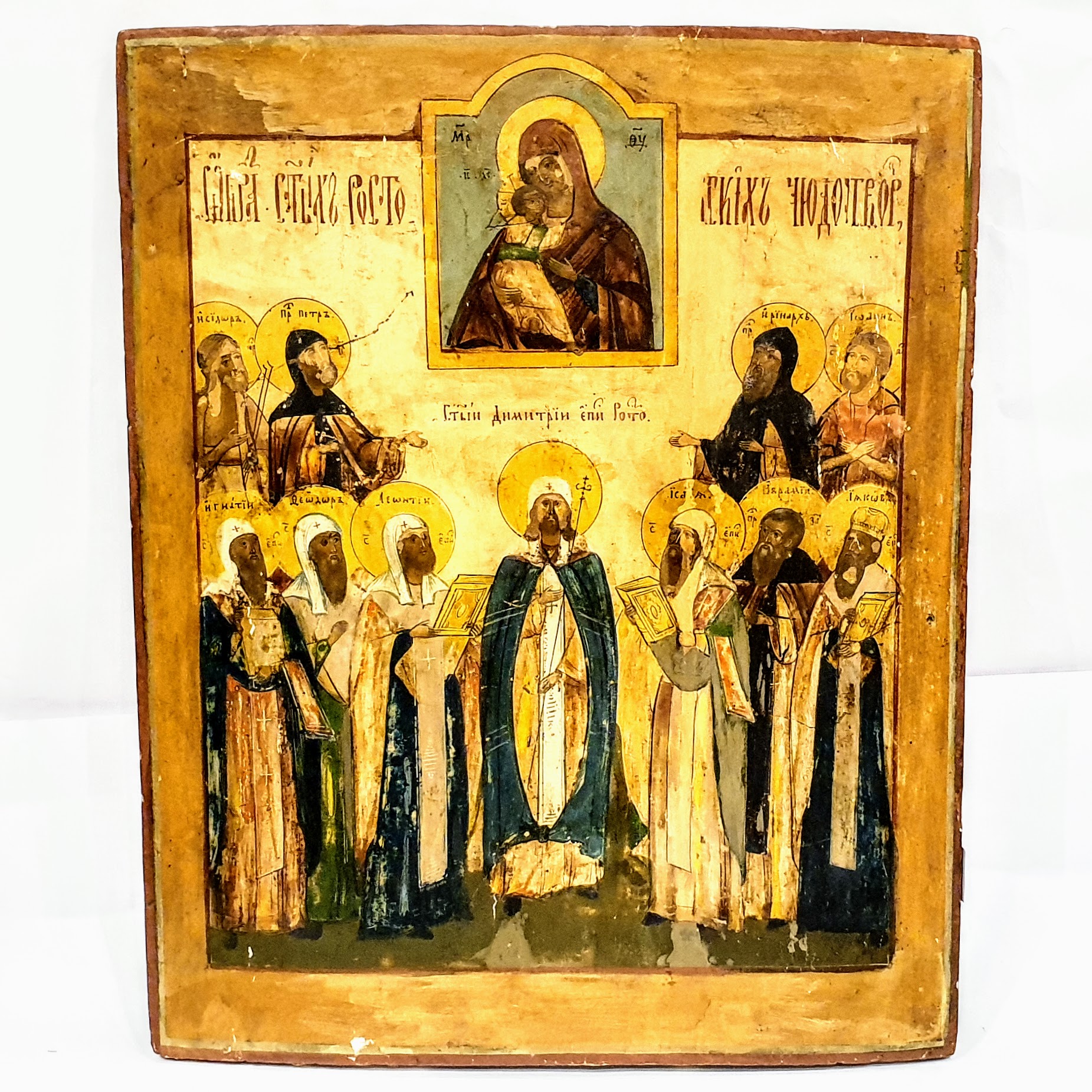 Oryginalna, duża ikona rosyjska przedstawiająca świętych. Stan dobry, obiekt o wysokiej wartości kolekcjonerskiej i sakralnej.