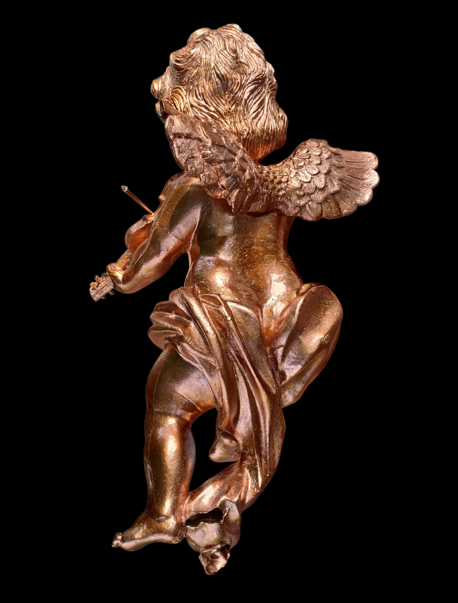 Duża, dekoracyjna figura Amora z pozłacanego tworzywa. Efektowny akcent wnętrzarski o antycznym charakterze.