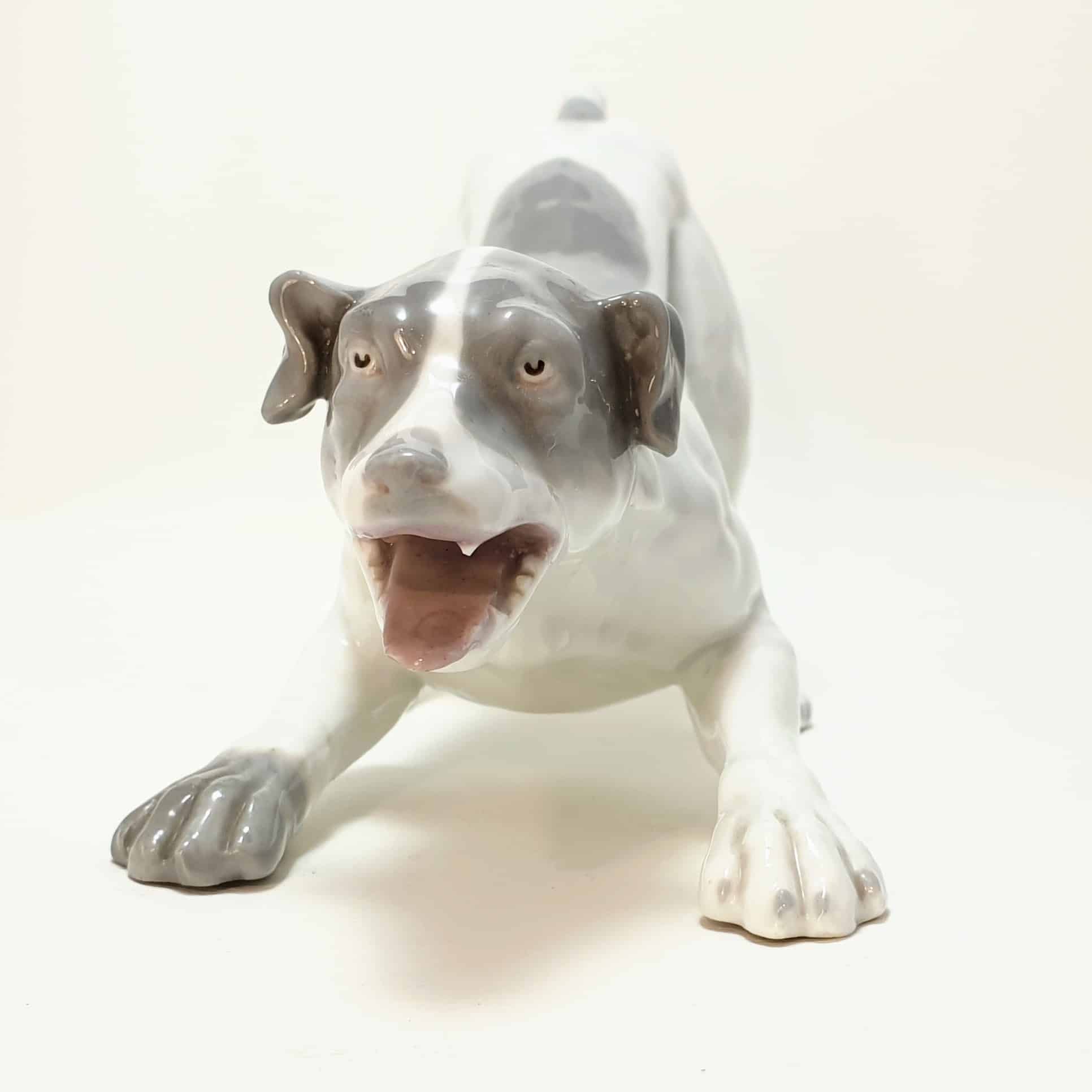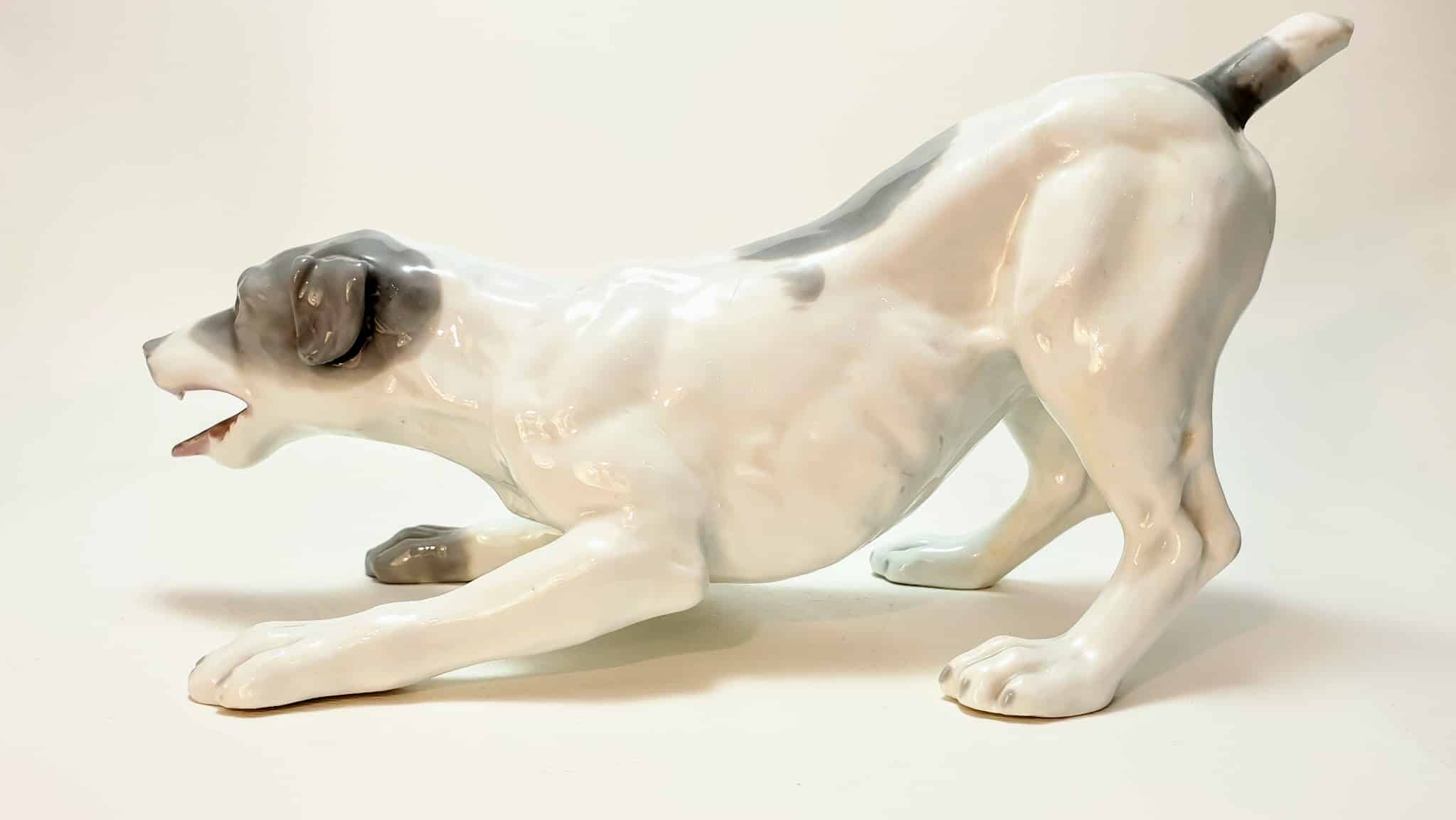 Gebrüdera Heubacha. Figurka porcelanowa Pies myśliwski ok. 1930-40. Prezentujemy wyjątkową figurkę dużego psa wykonaną z najwyższej jakości porcelany, pochodzącą z Niemiec z XX wieku. To nie tylko ozdoba, ale prawdziwy rarytas dla kolekcjonerów porcelany i miłośników animalistyki. Figurka zachwyca dbałością o szczegóły – od starannie wymodelowanej sierści po wyraziste, pełne życia spojrzenie. Porcelana o gładkiej, chłodnej w dotyku powierzchni, pokryta jest subtelnym połyskiem, a naturalna biel surowca podkreśla elegancję formy.