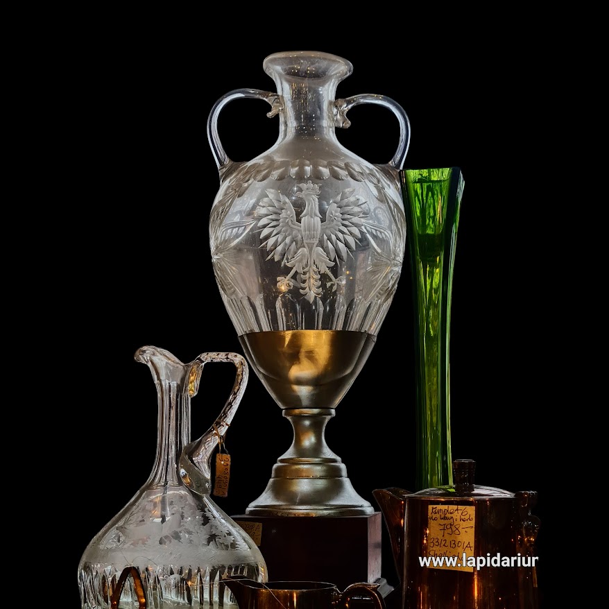 Zabytkowy, duży puchar nagrodowy z okresu międzywojennej Polski. Wykonany z kryształu i metalu, bogato zdobiony, zwieńczony lub ozdobiony wizerunkiem orła w koronie – oficjalnego symbolu II Rzeczypospolitej. Wymiary 48,5 x 17 CM