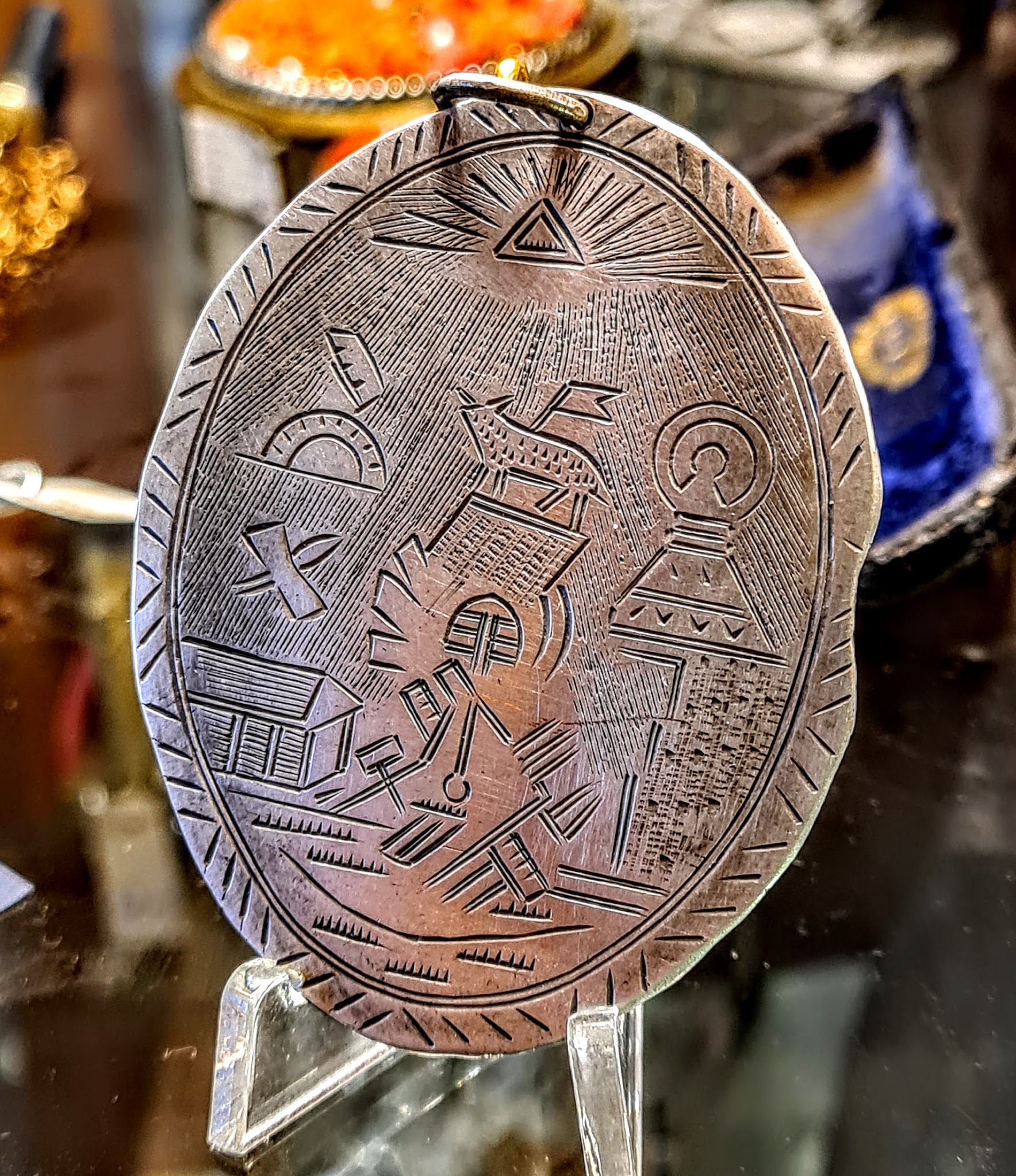 Duży srebrny amulet masoński XIX w. – Francja – symbolika wolnomularska