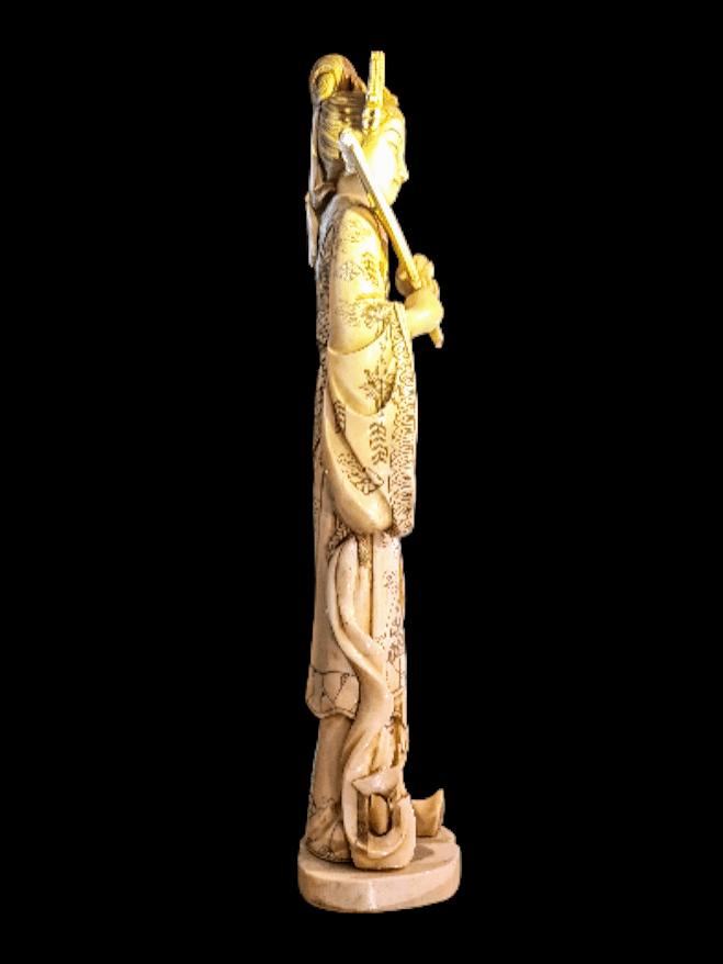 Figura kobiety z kośći, w tradycyjnym stroju, pochodząca z Japoni, datowana między XIX – XX wiekiem, mierzy ok. 39,5 cm wysokości, i 10 cm szerokości, wykonana z porcelany. Figura przedstawia młodą kobietę, odzianą w tradycyjny japoński strój, stojącą na postumencie. W prawej dłoni trzyma dwupłatowy wachlarz, z motywem smoka, utożsamaianym z siłą, modrąścią Boską, a przede wszytskim ochorną przed nieszczęściem. po preciwnej stronie, trzyma kwiat chryzntemy, co podkreśla powiązanie z narturą i porą roku, w tym przyapdku jesienią. Jest ubrana w tradycyjny japoński strój, długie rękawy sugrują na szate Furisode, noszoną przez kobiety młode i niezamężne. W skład elementów zdobniczych, kimono posiada pas Obi, zęsto najdroższy i najbardziej dekoracyjny element. Tradycją japońską, jest przpasanie go sznurem bi-jime i ozdobną tkaniną obi-age. Furisode posiada bogate zdobienia motywem chryzantem, której płatki oblekają poszycie rękawów, a także występują w całości. Ponadto widoczny jest motyw fal, a na plecach znajuduje się Kikkō (Wzór żółwiej skorupy), symbol długowieczności, szczęścia i ochrony. Często stosowany jako tło (jimon) dla innych, ważniejszych motywów (np. kwiatów, ptaków). Fryzura upięta w kok, przepasana opaską w typie „Kanzashi”, formalizuje cały strój, i jest sztandarowym przykładem tego typu ozdób, w tym wypadku użyty został motyw ptaka, z grzbieniami okalającymi głowę figury.