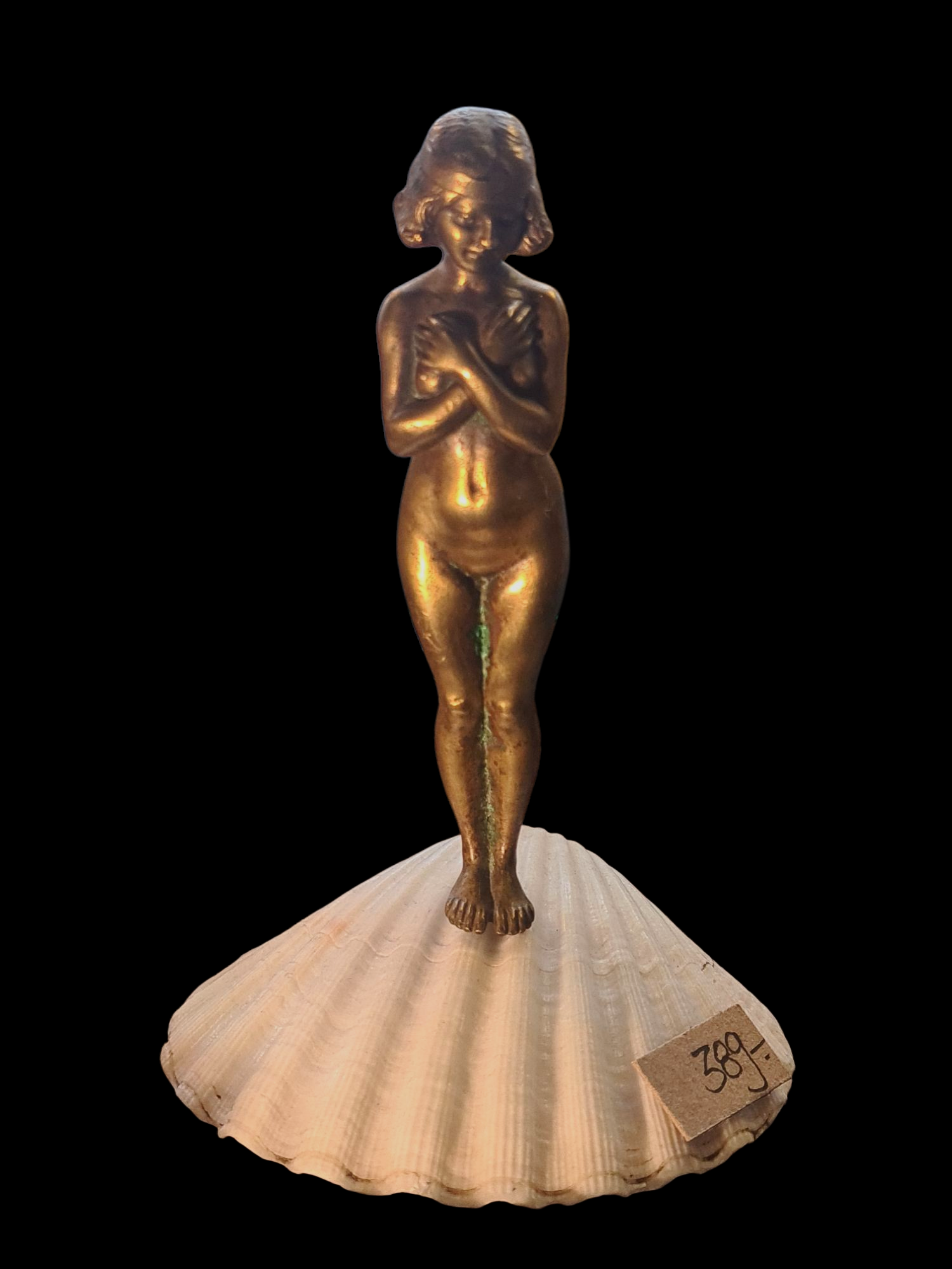 Secesyjna/Art Deco figurka z brązu przedstawiająca narodziny Wenus na muszli. Piękny obiekt dekoracyjny i kolekcjonerski z początku XX wieku.
