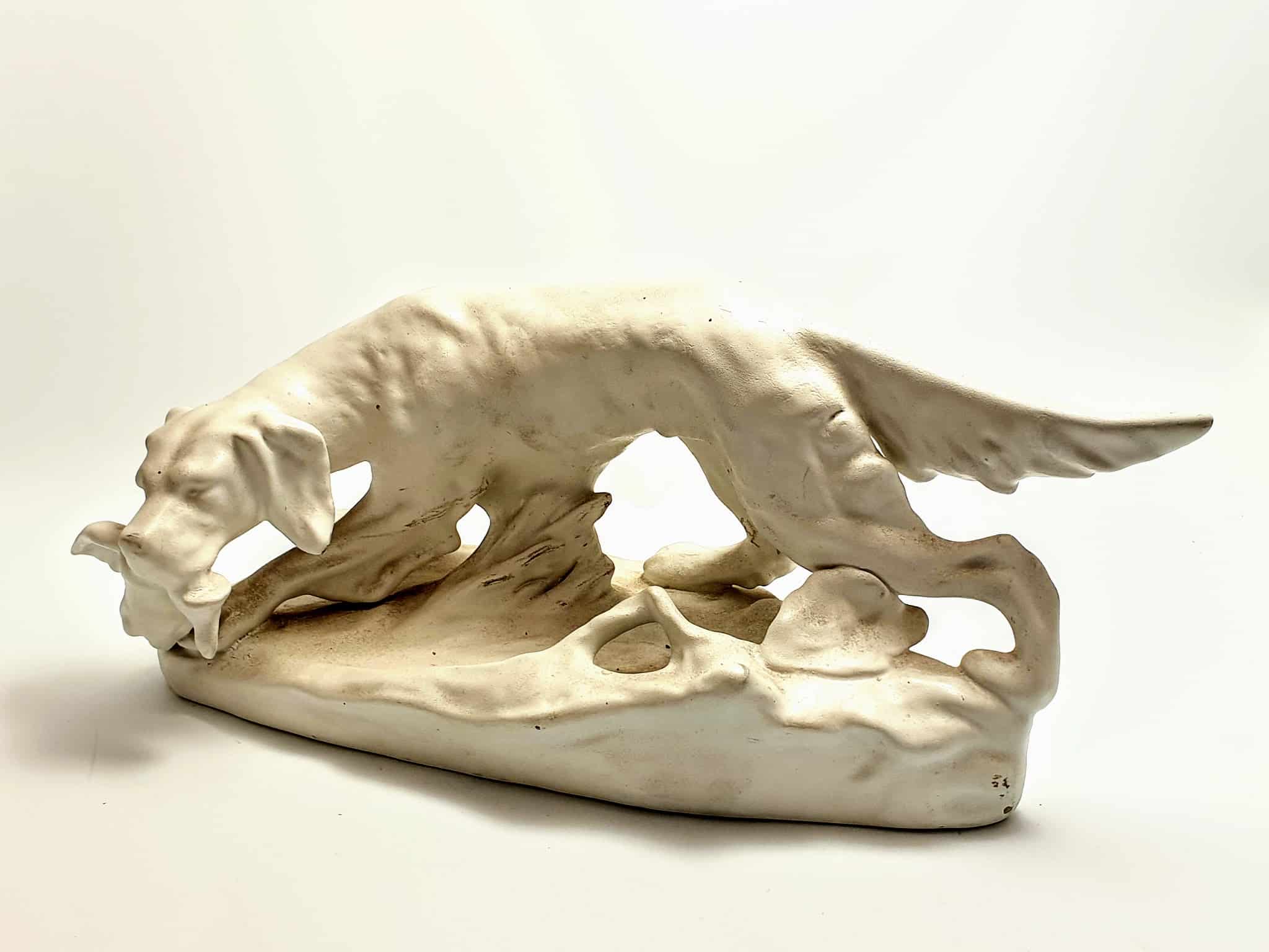 Porcelanowa duza ponad 35 cm figurka psa myśliwskiego (seter/chart) Royal Dux Bohemia. Dynamiczna poza, biała porcelana, lata 20. XX wieku. Stan – figurka sklejana i malowanawtórnie na biało .Uszkodzenia ukryte . 25% ceny rynkowej .