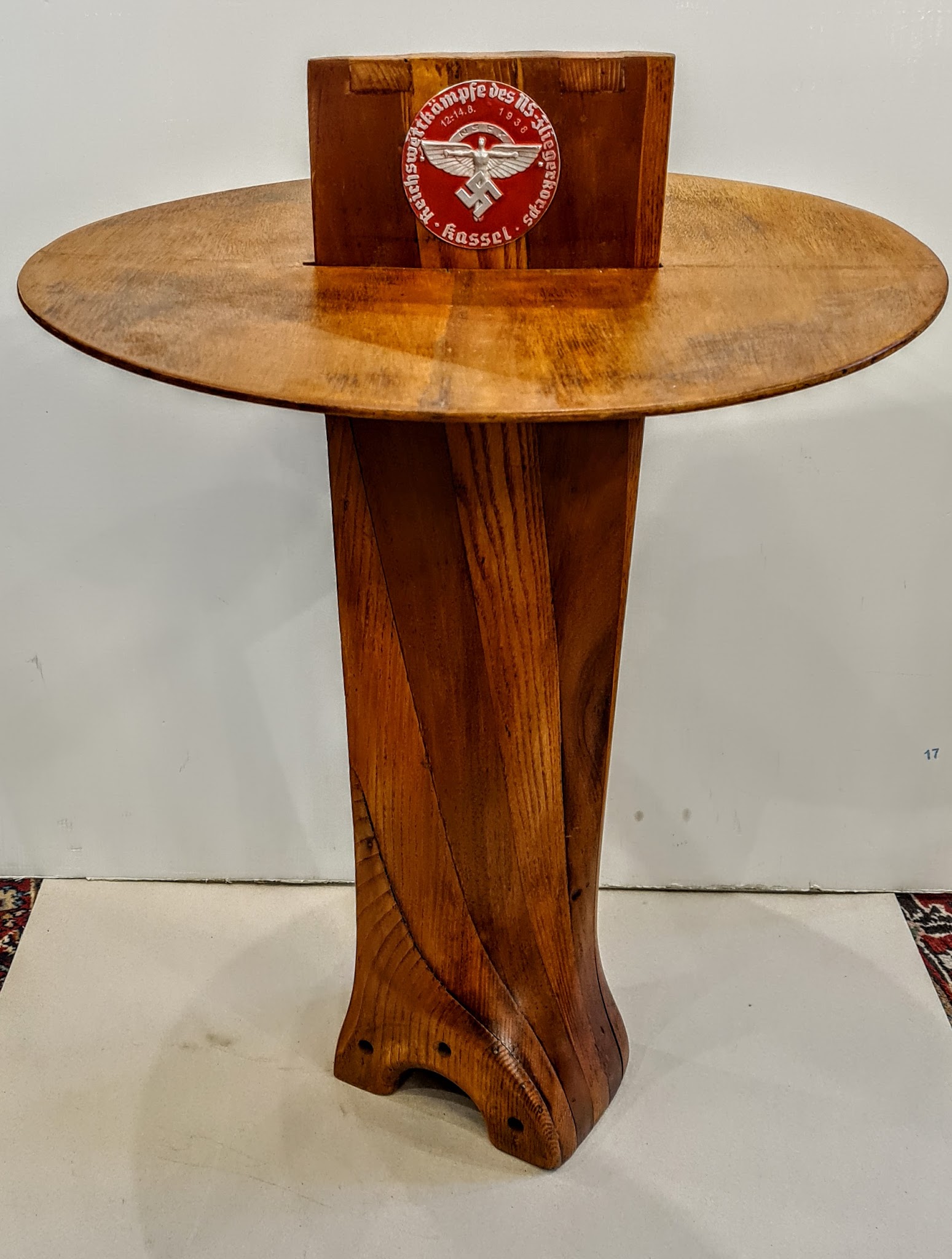 Wyjątkowy i niezwykle rzadki przedmiot kolekcjonerski – autentyczny fragment drewnianego śmigła lotniczego z okresu II wojny światowej, zaadaptowany na unikalny stolik kawowy. Ten imponujący relikt historii lotnictwa nosi na sobie oryginalną, zachowaną w dobrym stanie plakietkę NSKK (Nationalsozialistisches Kraftfahrkorps), co nadaje mu dodatkową, historyczną wartość i wyraźnie określa jego wojskowe pochodzenie.