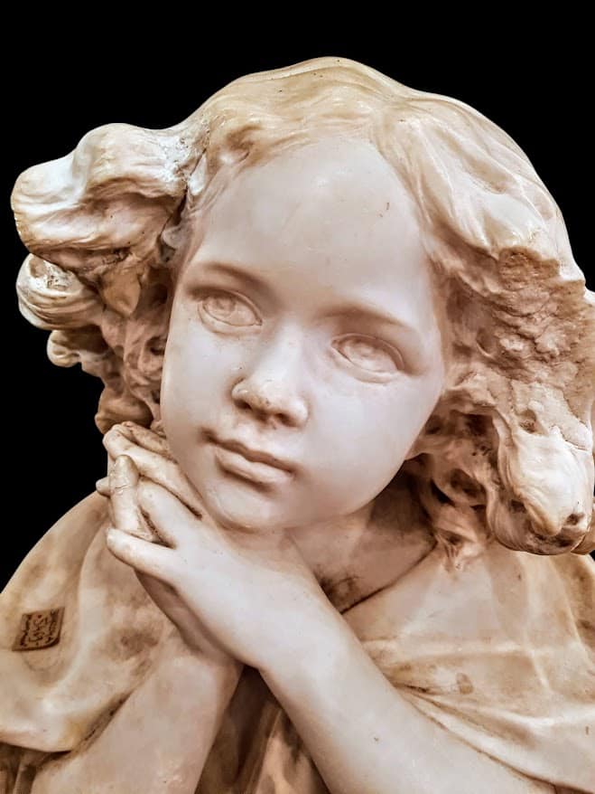 Pokażnych rozmiarów rzezba z alabastru . Dziewczynka – popiersie . Włochy (?) Ip. XX w. Niesygnowana .