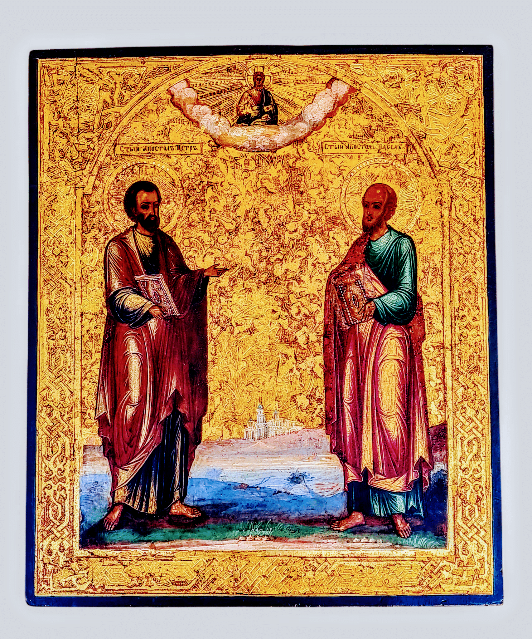 Autentyczna ikona prawosławna Świętych Piotra i Pawła (Susałka), malowana na złoconym tle, w bardzo dobrym stanie bez reperacji.