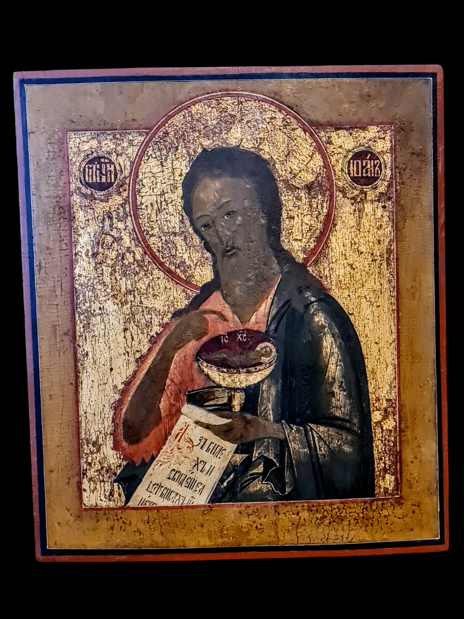 XIX-wieczna ikona rosyjska Św. Jana Chrzciciela typu Anioł Pustyni, tempera na desce.