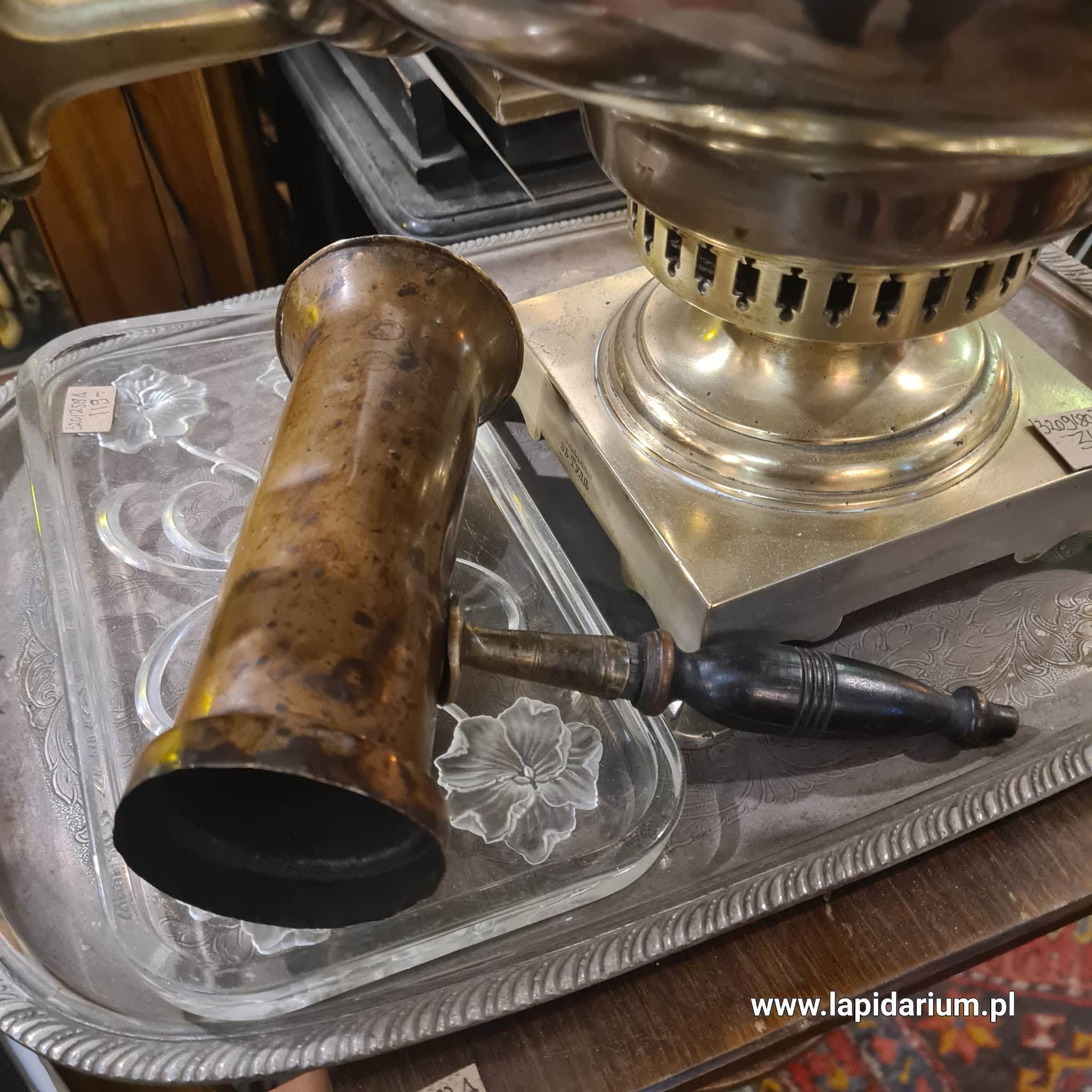 Komin, zwany także „trąbką” lub „nasadką”, pełnił kluczową funkcję w tradycyjnym samowarze. Nakładany na rurkę z ruszta, kierował dym i gorące powietrze z paleniska ku górze, intensyfikując ciąg i przyspieszając proces gotowania wody. Prezentowany egzemplarz wykonany jest z solidnego mosiądzu, który z czasem nabrał pięknej, patynowanej patyny, świadczącej o jego wieku i autentyczności.