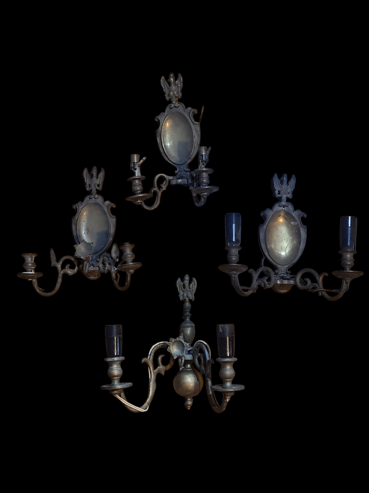 Mosiadziane konkiety ścienne w stylu Księstwa Warszawskiego z czasów PRL. Wymagają naprawy instalacji elektrycznej. Cena dotyczy jednej sztuki, różne warianty do wyboru. cena 1 sztuki do wyboru.