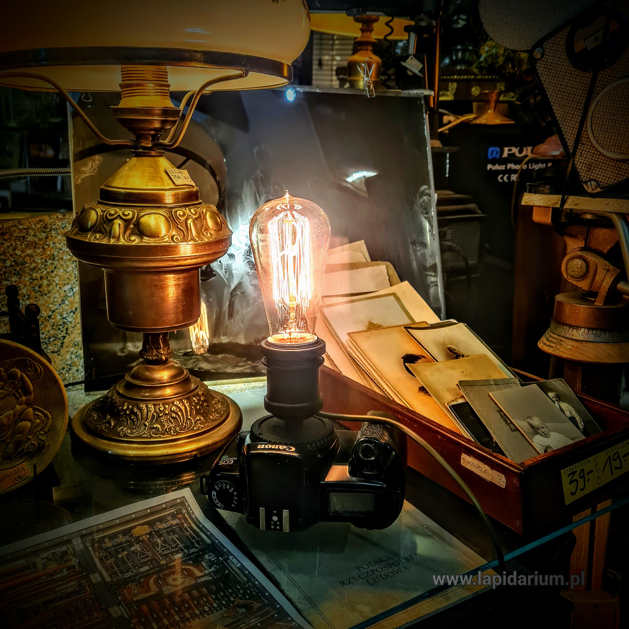 Unikatowa lampa dekoracyjna z żarówką Edisona oprawiona w autentyczny aparat fotograficzny. Ręczna praca z Pracowni Kilińskiego. Na zyczenie klientów oprawiamy inne aparaty z naszej kolekcji .