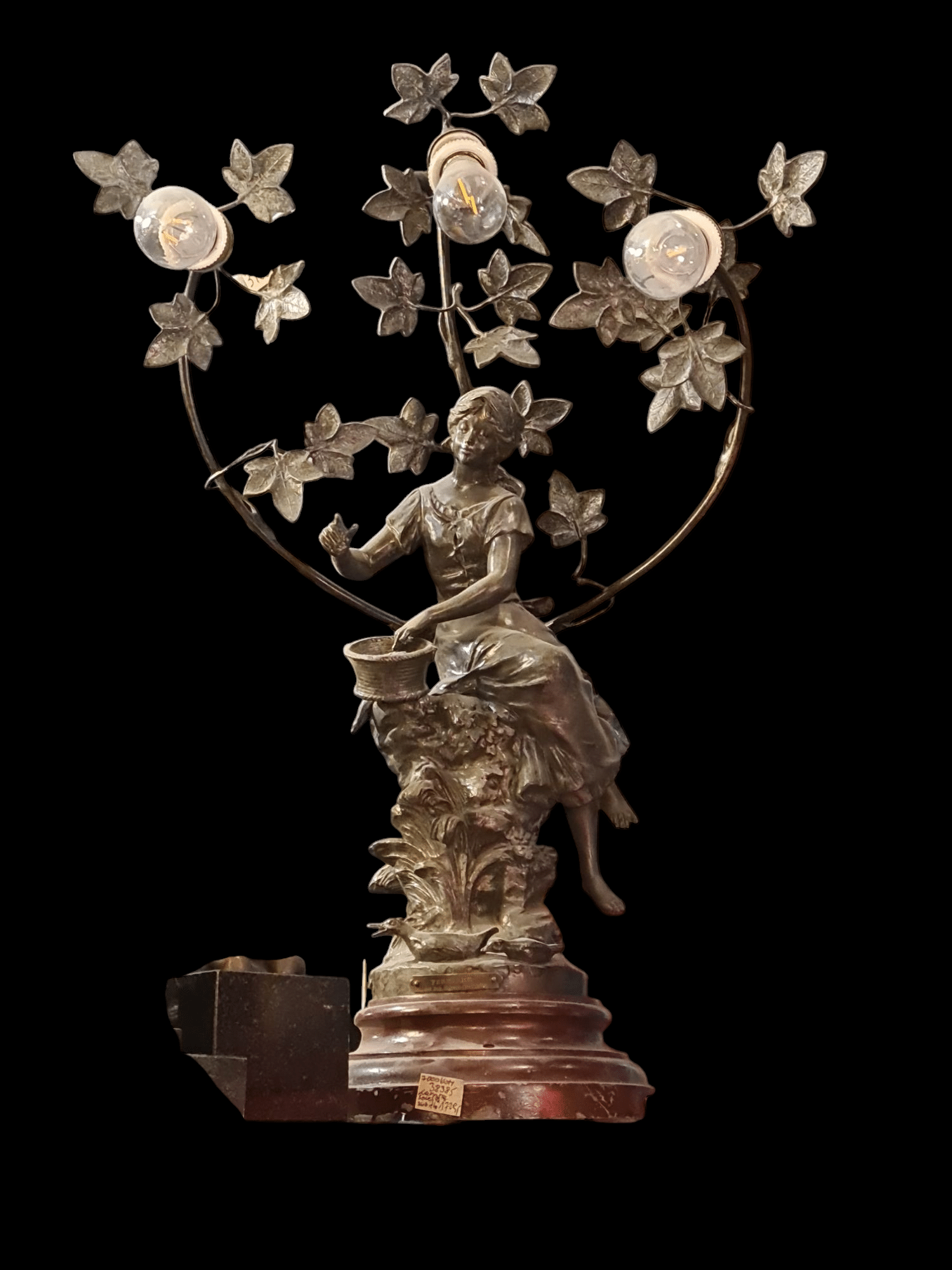 Centralnym motywem lampy jest pełna gracji, smukła postać kobiety opleciona wijącą się winoroślą. To typowy dla secesji motyw łączący ludzką formę z organicznymi, roślinnymi elementami, symbolizującymi życie, naturę i zmysłowość. Mistrzowsko odlana z mosiądzu figura zachwyca detalem – od subtelnych rysów twarzy, przez płynność draperii szat, aż po pojedyncze liście i grona winorośli.