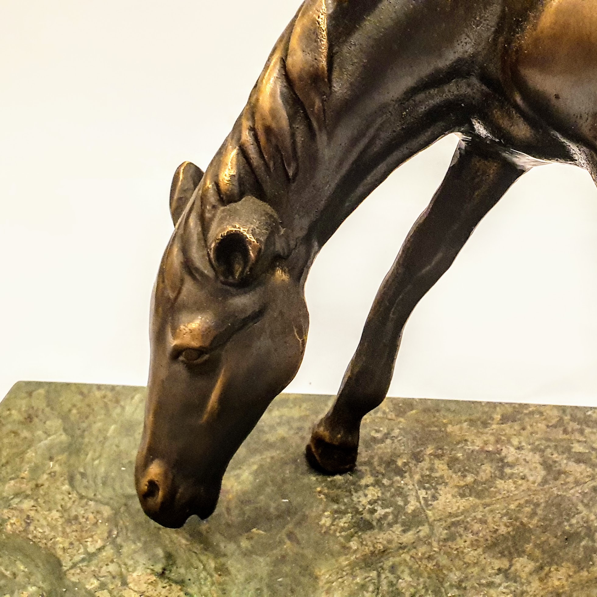 Figura przedstawia konia w dynamicznej, pełnej godności pozie. Mosiądz, z którego została wykonana, nabrał pięknej, ciepłej patyny czasu, podkreślającej detale anatomii zwierzęcia i nadającej całości szlachetny, antykwaryczny charakter. Solidna, ciężka podstawa z naturalnego marmuru nie tylko stabilizuje kompozycję, ale i dodaje jej prestiżu oraz zimnego blasku, tworząc doskonały kontrast z ciepłem metalu.