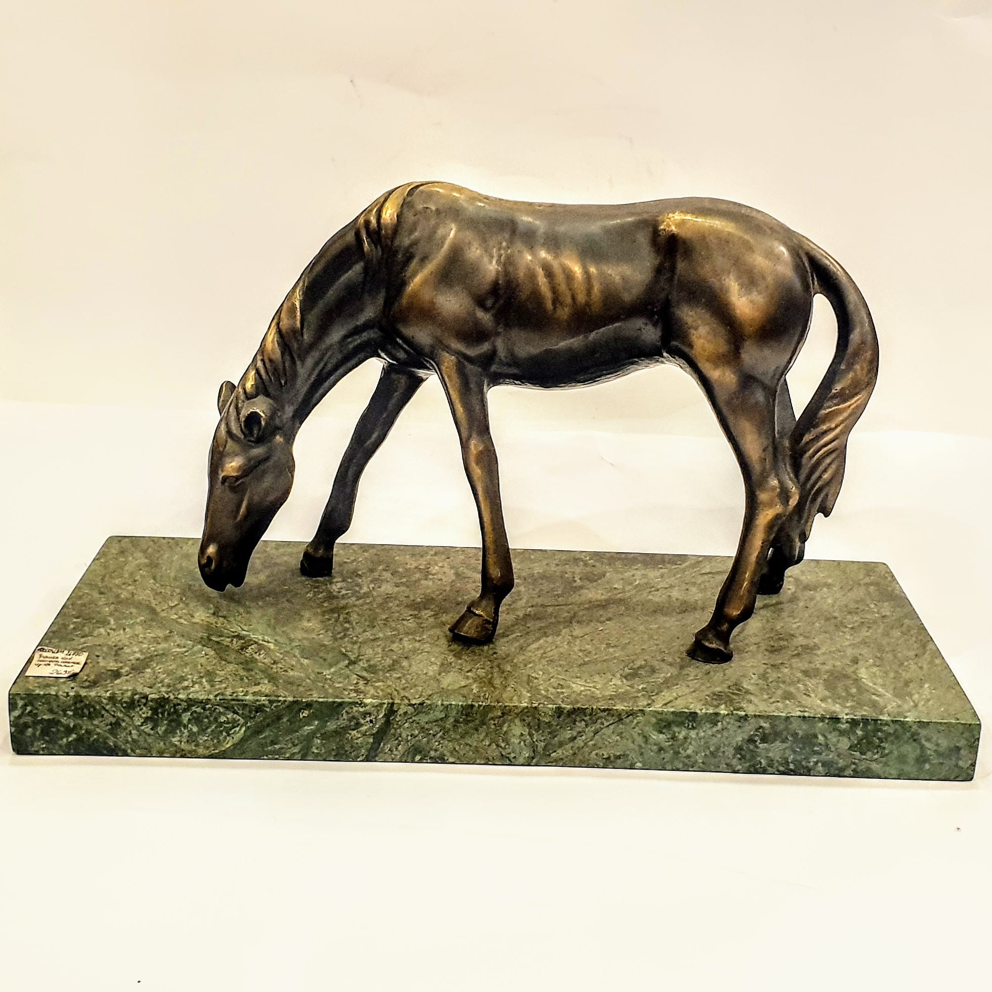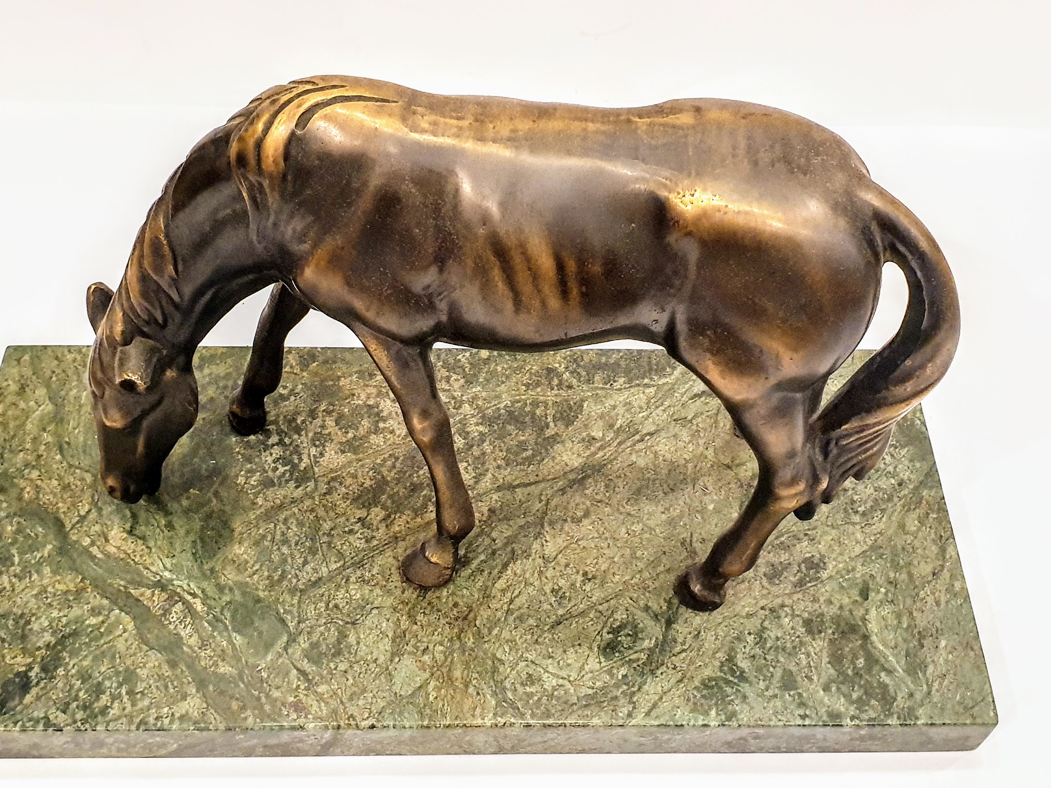 Masywna figura konia z mosiądzu na marmurowej podstawie. Przykład polskiego rzemiosła artystycznego z lat 60. XX wieku.