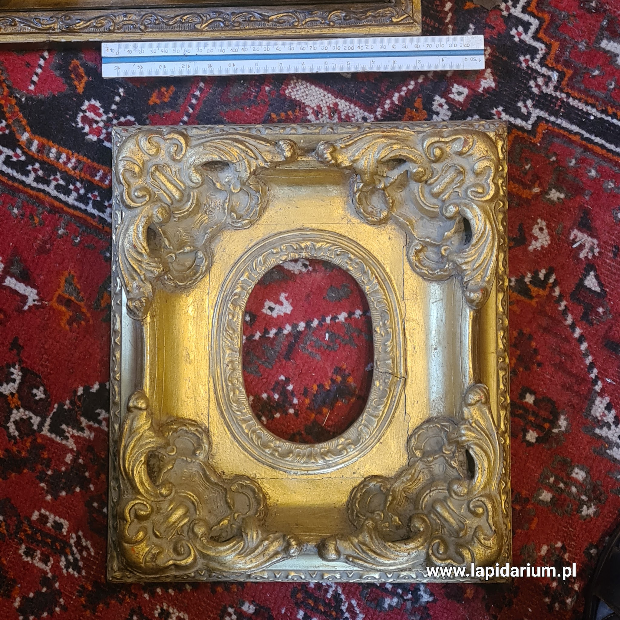 Masywna, zabytkowa rama wykonana z drewna i gipsu. Unikalny okaz sztuki użytkowej i dekoracyjnej o kolekcjonerskim charakterze.