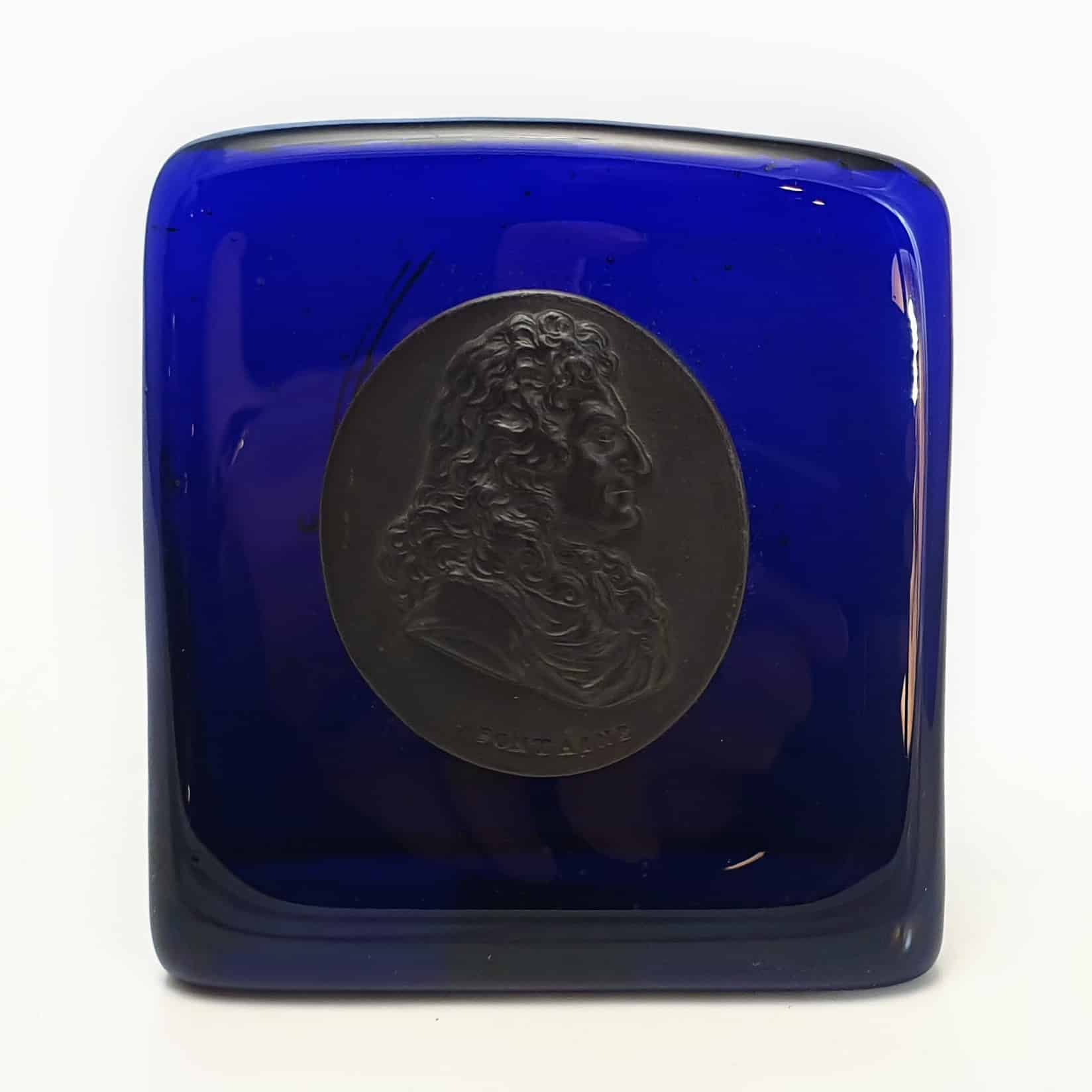 Szkło kobaltowe – znane ze swojej głębokiej, nasyconej barwy i charakterystycznego połysku – nadaje przedmiotowi szlachetności i sprawia, że doskonale prezentuje się zarówno w witrynie, jak i na biurku czy komodzie. Metalowy medalion stanowi wyrazisty kontrast dla chłodnego, niebieskiego tła, a detale rysunku twarzy i peruki sugerują ręczne wykonanie z dbałością o szczegóły.