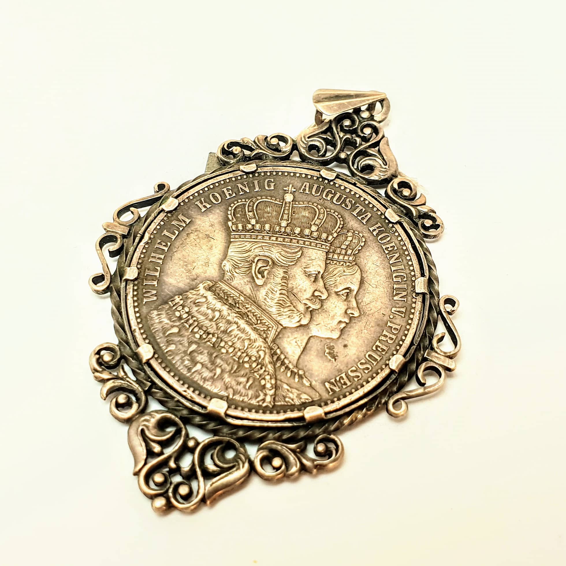 Oferujemy Państwu niezwykły, kolekcjonerski przedmiot o podwójnej naturze: medal i wisiorek w jednym. Ten unikatowy egzemplarz został wykonany z monety lub na wzór monety, a jego centralnym motywem jest wizerunek pruskiej pary królewskiej – króla Wilhelma I oraz królowej Augusty.