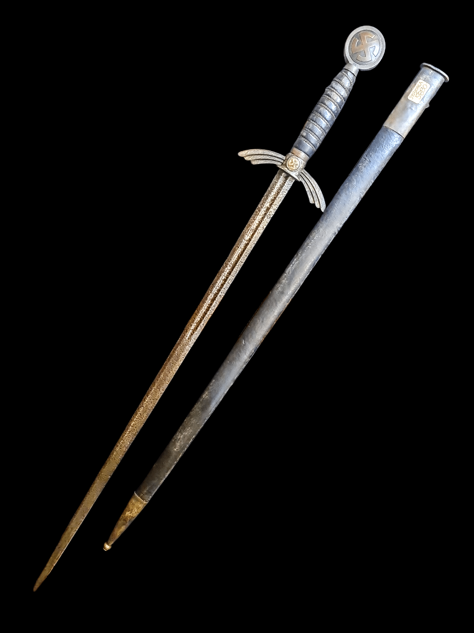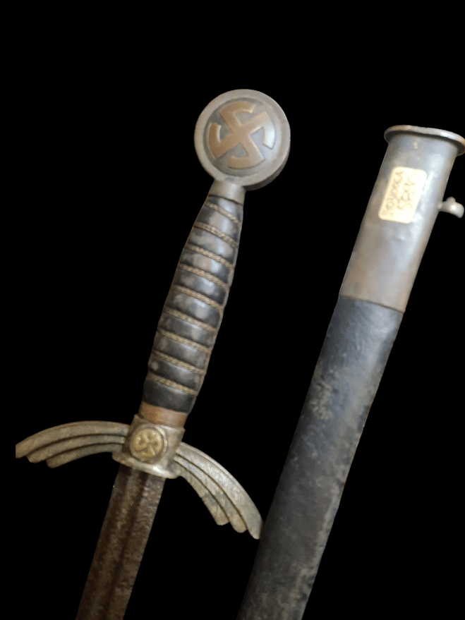 Miecze paradne Luftwaffe (niemieckich sił powietrznych) stanowiły element oficerskiego umundurowania galowego, symbol statusu i przynależności do elitarnej formacji. Były one często bogato zdobione, z elementami emblematów Luftwaffe – orłem trzymającym swastykę w wieńcu laurowym. Ten egzemplarz, pomimo upływu czasu, nosi autentyczne ślady historii.