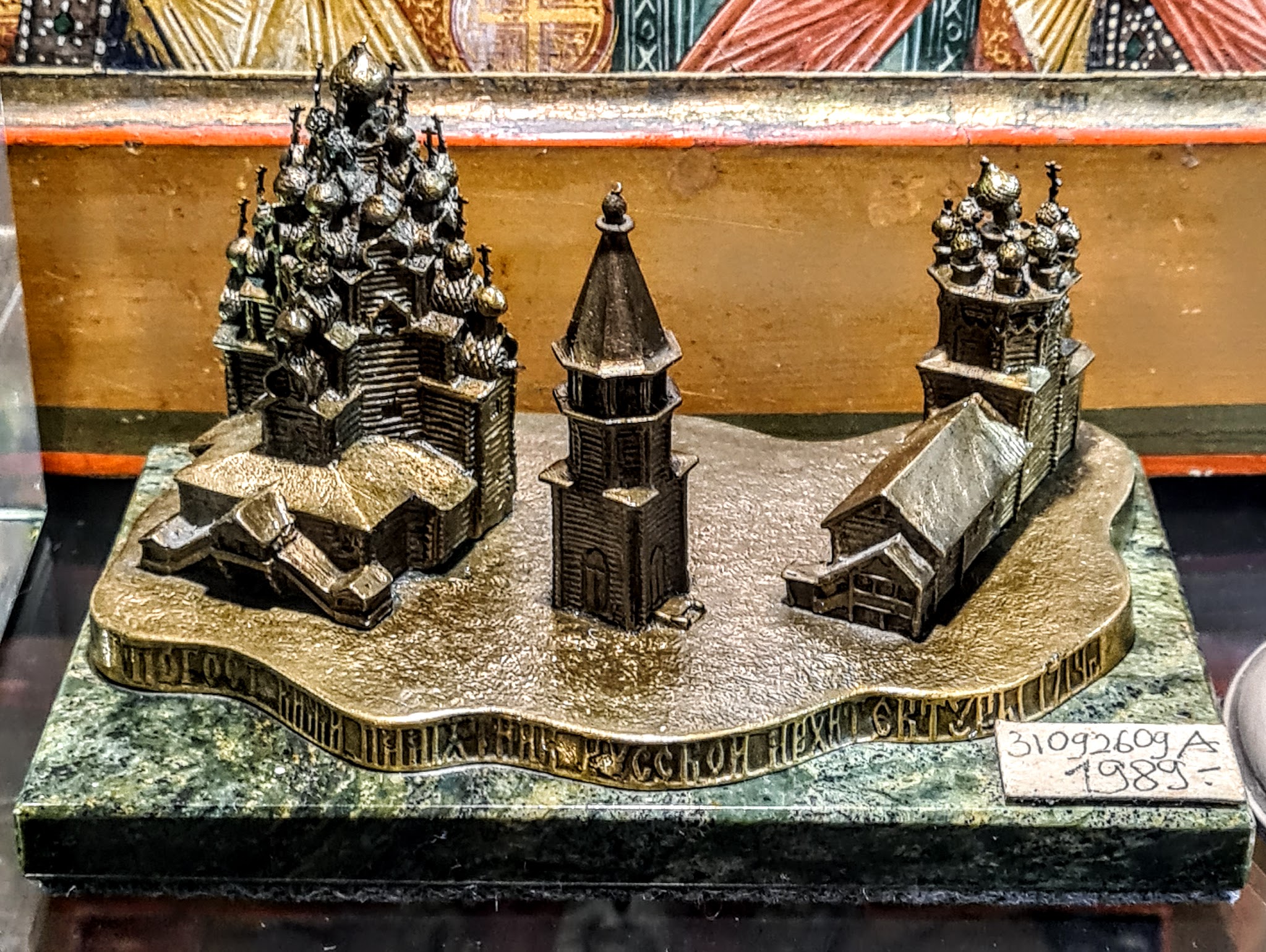 Miniatura stanowi finezyjne odwzorowanie charakterystycznej sylwetki kompleksu, słynącego przede wszystkim z 22-głowowej Cerkwi Przemienienia Pańskiego, zbudowanej bez użycia gwoździ. Przedmiot, pochodzący z XX wieku, jest nie tylko dekoracyjnym drobiazgiem, ale przede wszystkim materialnym śladem podróży, świadectwem zainteresowania kulturą i dziedzictwem sąsiedniego kraju. Tego typu pamiątki były często nabywane przez turystów i kolekcjonerów jako namacalna pamięć o odwiedzanym miejscu.