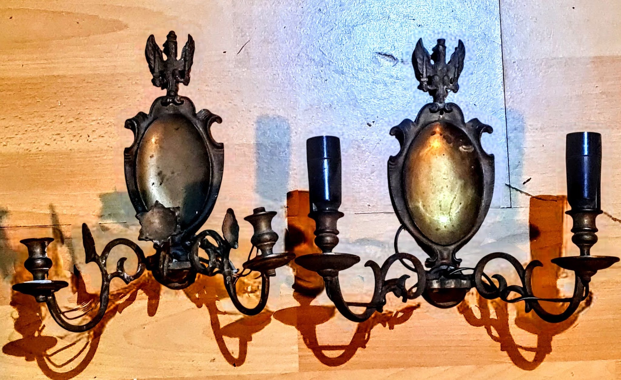Para zabytkowych mosiężnych kinkietów ściennych z polskim orłem, w stylu Księstwa Warszawskiego. Gotowe do renowacji i elektryfikacji.