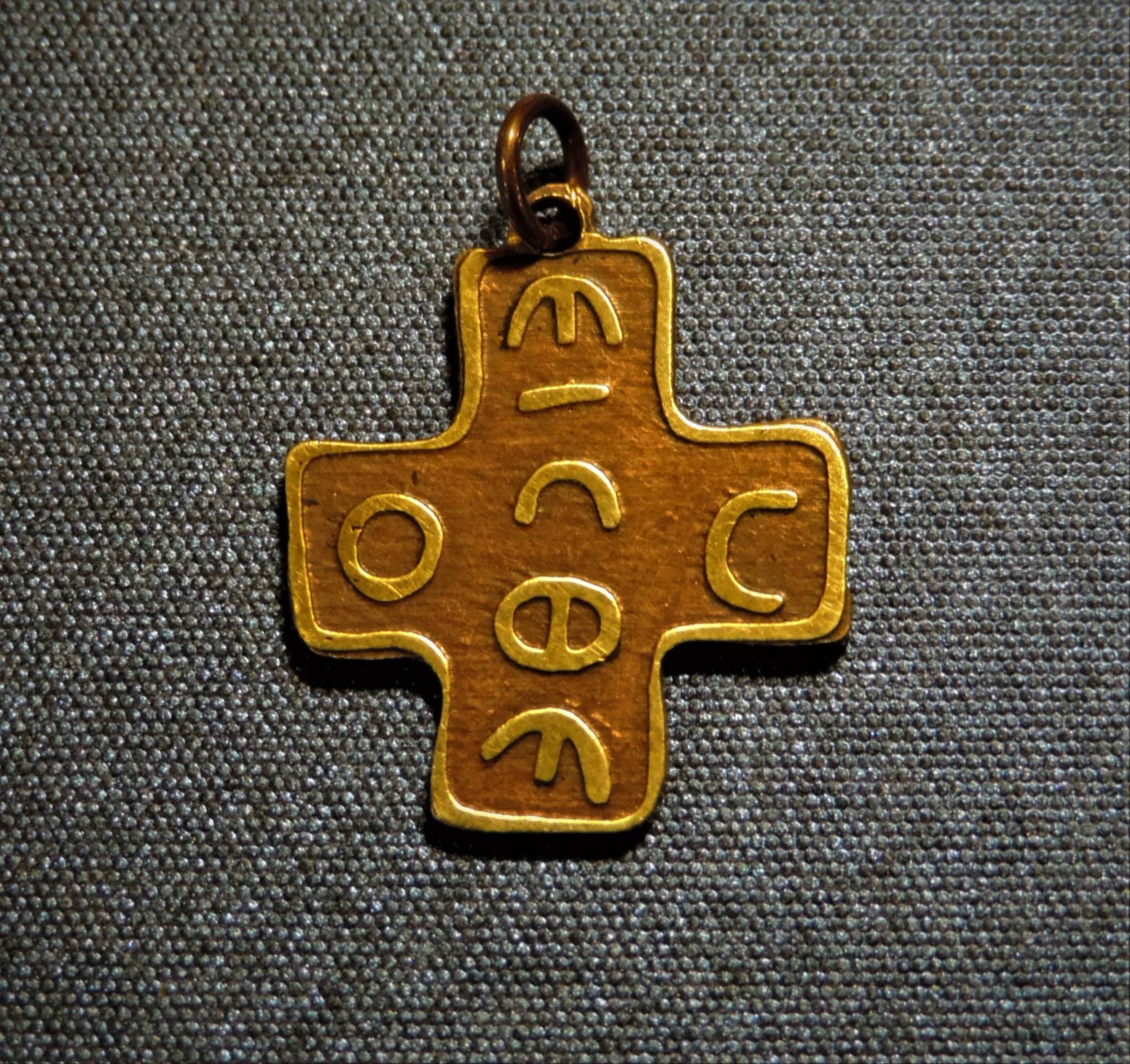 Ręcznie wykonany z mosiądzu miedziowanego krzyżyk chlebowy – kopia starożytnego symbolu. Powstał w latach 80. w pracowni Mistrza Kilińskiego w Warszawie.