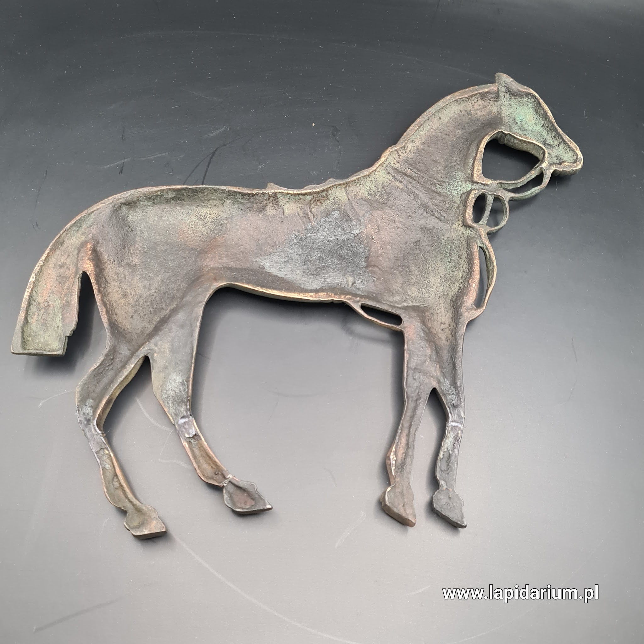 Solidna, mosiężna plakieta z reliefem konia. Antyczny, dekoracyjny przedmiot o kolekcjonerskiej wartości, pokryty szlachetną patyną.