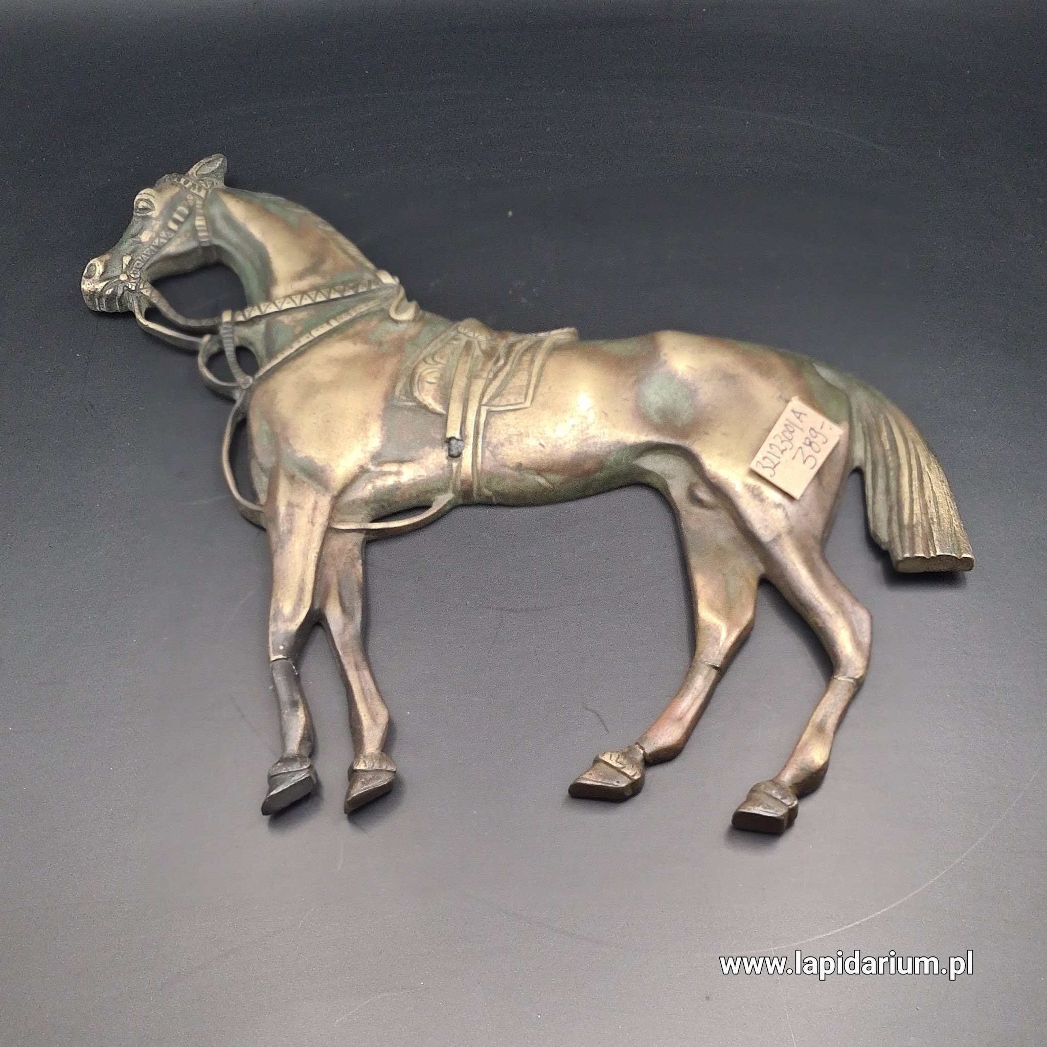 Plakieta wykonana jest z precyzyjnym odwzorowaniem detali – muskularna sylwetka zwierzęcia, dynamika jego przedstawienia oraz finezyjne opracowanie faktury świadczą o wysokim kunszcie rzemieślniczym. Mosiądz, dzięki upływowi czasu, zyskał szlachetną, stonowaną patynę, podkreślającą antyczny charakter obiektu. Tego typu plakiety często pełniły funkcję dekoracyjną, zdobiły skrzynie, meble, uprząż końską lub były elementem wyposażenia jeździeckiego i militarnych parad.
