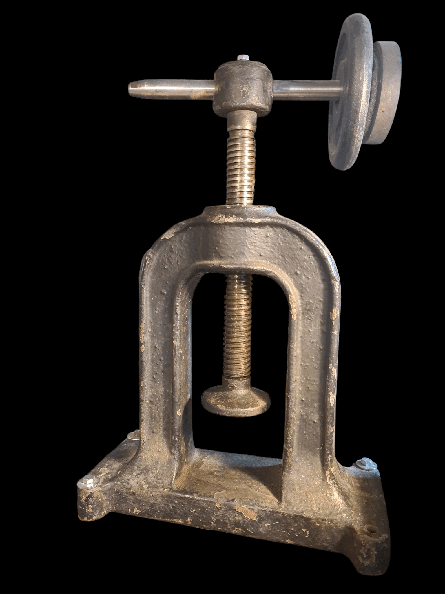 Prasa charakteryzuje się kompaktowymi wymiarami – jej wysokość to około 50 cm, co czyni ją idealnym obiektem do ekspozycji w pracowni, gabinecie lub jako industrialny element dekoracyjny w nowoczesnych wnętrzach. Jej konstrukcja, najprawdopodobniej stalowa lub żeliwna, świadczy o dbałości o trwałość i funkcjonalność. Tego typu urządzenia były niegdyś nieodzownym elementem warsztatów ślusarskich, jubilerskich, introligatorskich lub małych zakładów rzemieślniczych, gdzie służyły do precyzyjnego sprasowywania, łączenia lub formowania materiałów.