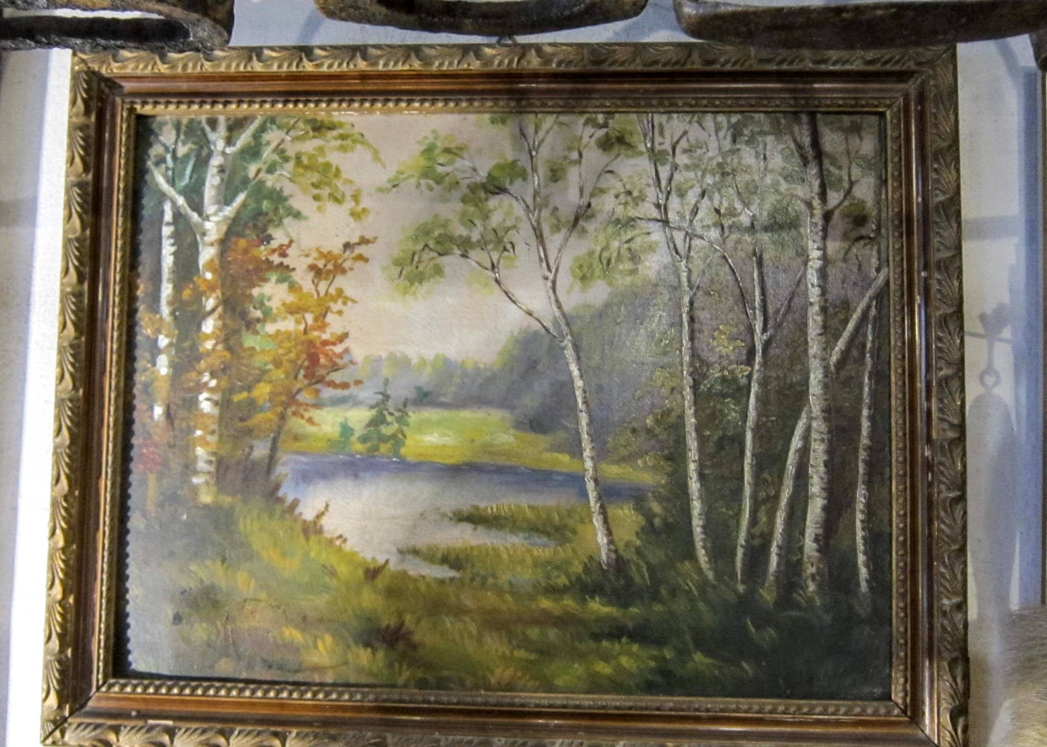 Nastrojowy obraz olejny przedstawiający leśny pejzaż z jeziorkiem. Autentyczny przykład polskiego malarstwa ludowego XX wieku o wartości kolekcjonerskiej.