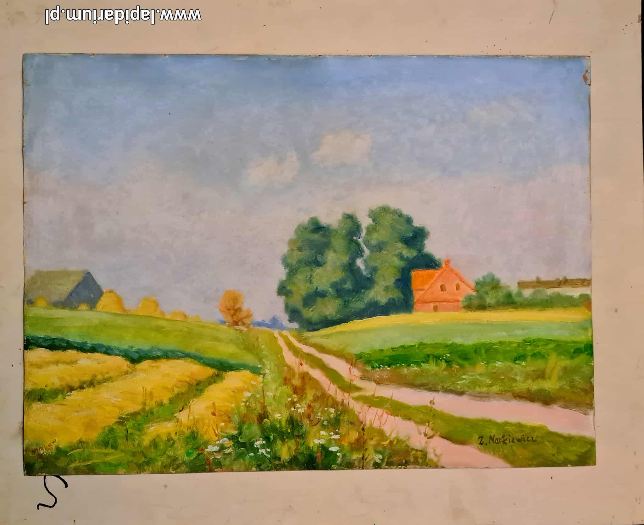 Zapraszamy do odkrycia niezwykłego, nastrojowego dzieła, które przeniesie Państwa w klimat tradycyjnej polskiej wsi. Ten urokliwy obraz olejny, namalowany na płycie, przedstawia sielski, wiejski pejzaż, pełen spokoju i nostalgii. Choć autor pozostaje nieznany, praca zdradza rękę wrażliwego, być może amatorskiego malarza, który z pietyzmem oddał charakterystyczną architekturę i przyrodę polskiego krajobrazu.