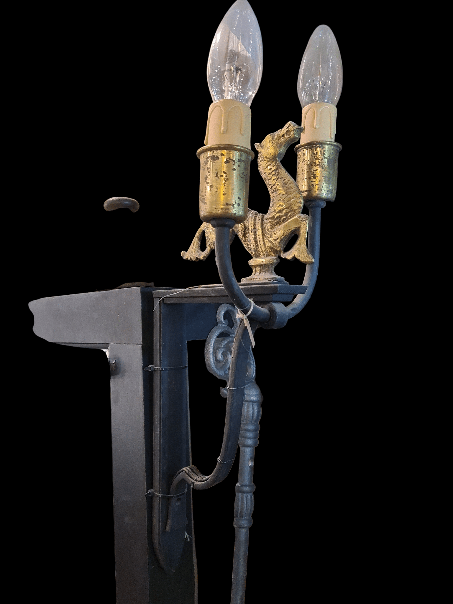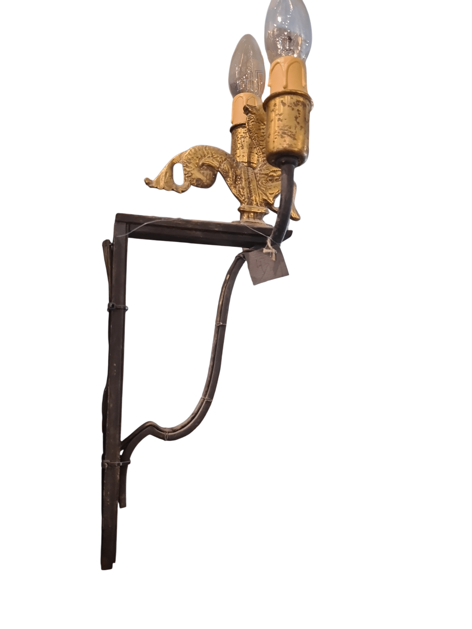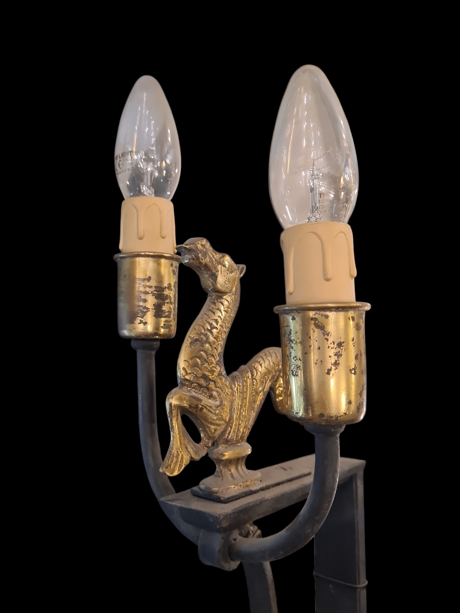 Unikalna para mosiężnych kinkietów ściennych z XX wieku, zdobiona dekoracjami hipokampów. Dwa ramiona, stan kolekcjonerski. Cena dotyczy jednej sztuki .