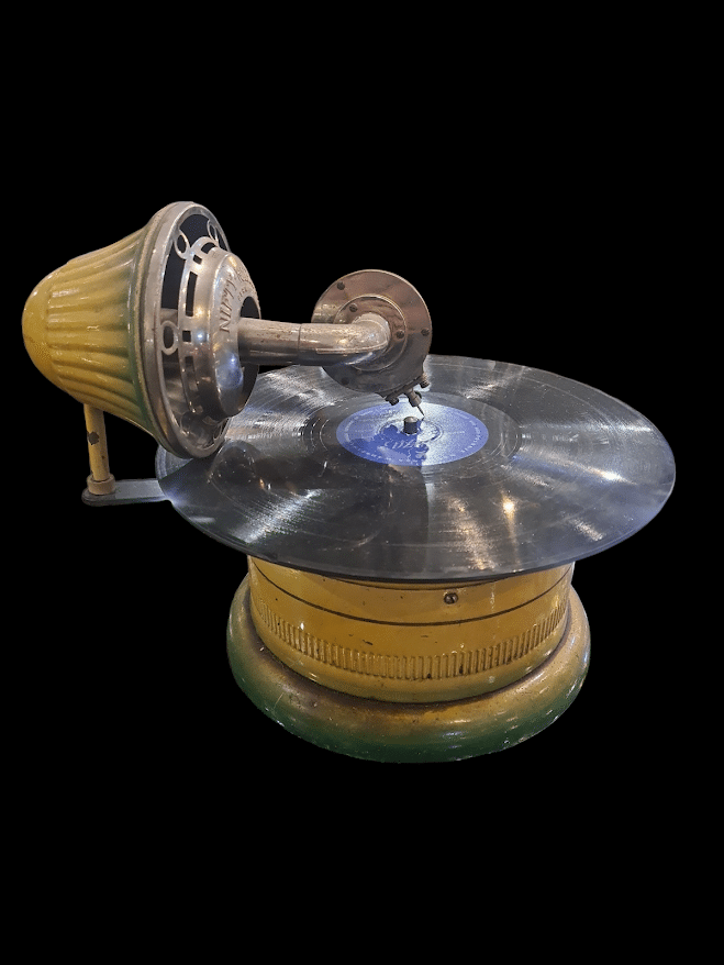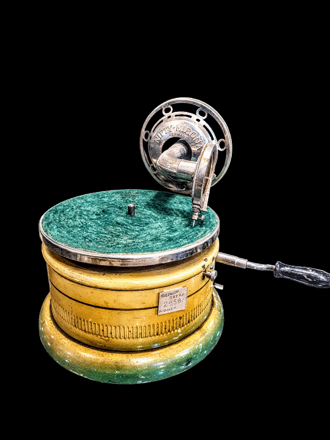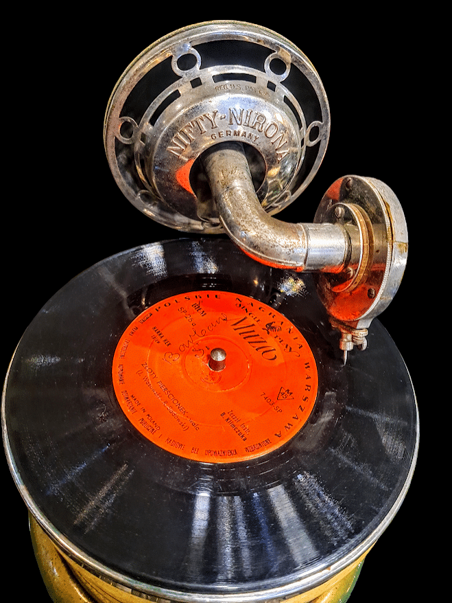 Patefon miniaturowy, do użytku turystcznego albo dziecięcego, Nifty-Nirona, pochodzący z Niemiec, XIX – XX wiek. Miniaturowy patefon to zminiaturyzowana, przenośna wersja urządzenia do mechanicznego odtwarzania dźwięku z płyt. Oryginalnie było to urządzenie o napędzie mechanicznym, wynalezione przez braci Pathé i produkowane głównie w latach 1905–1920. Patefon w odruznieniu od gramofonu korzystał z płyt wgłębnych i odtwarzał dźwięk od środka na zewnątrz, używając kulki (np. szafirowej) zamiast igły. Ta konstrukcja niemal eliminowała szumy, co było znacznym usprawnieniem względem gramofonu. Ich przeznaczeniem było używanioe go w celach turystycznych, dziecięcych (jako zaawansowana zabawka), oraz domowych (gdzie liczył się mniejszy rozmiar).Miniaturowe patefony były w swoim czasie zaawansowanymi technicznie urządzeniami, które demokratyzowały dostęp do muzyki, umożliwiając jej słuchanie poza domem. Dziś są poszukiwanymi obiektami kolekcjonerskimi.