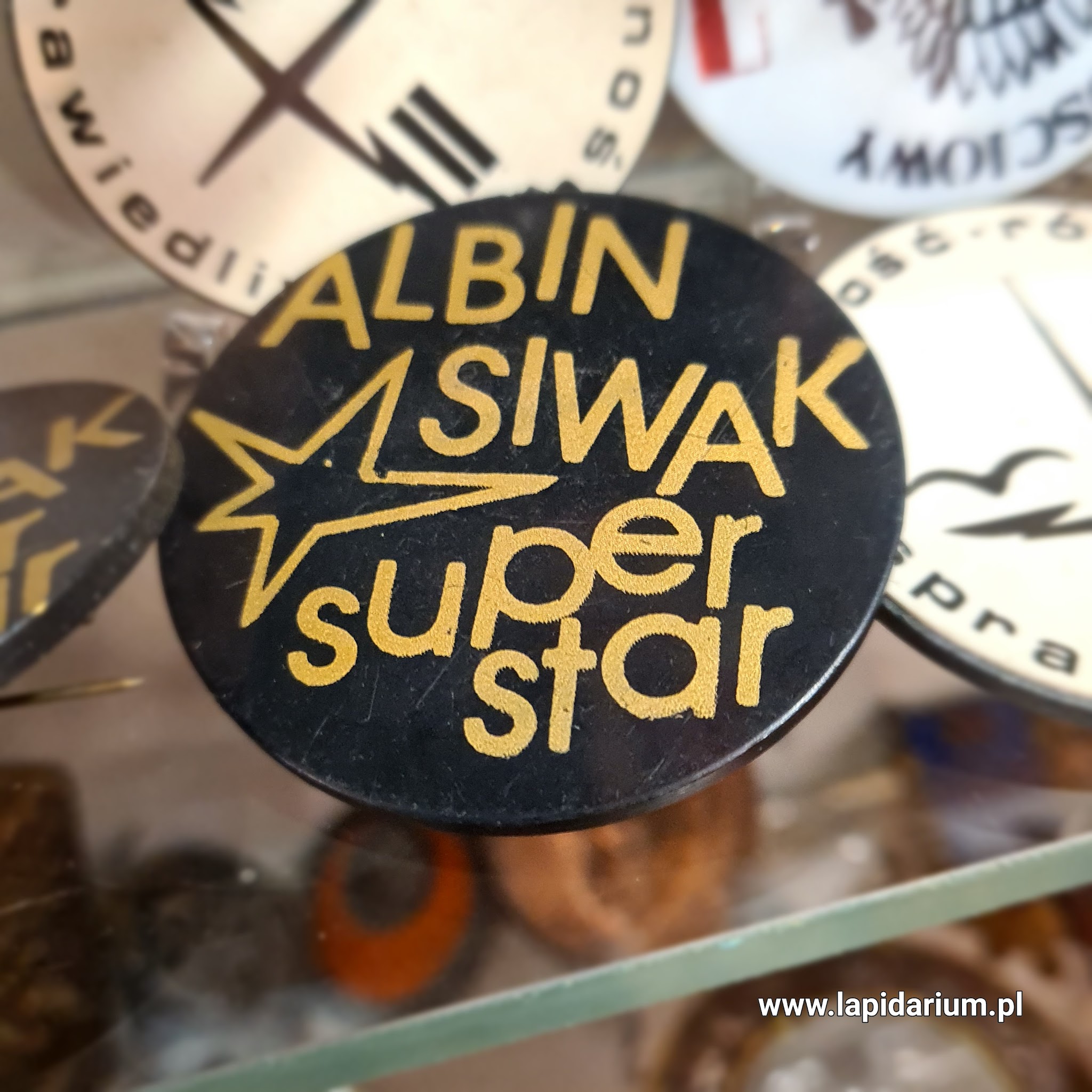 Oryginalna plakietka satyryczna z lat 80. z napisem „Albin Siwak super star”, będąca reliktem podziemnej twórczości antykomunistycznej z okresu Solidarności.