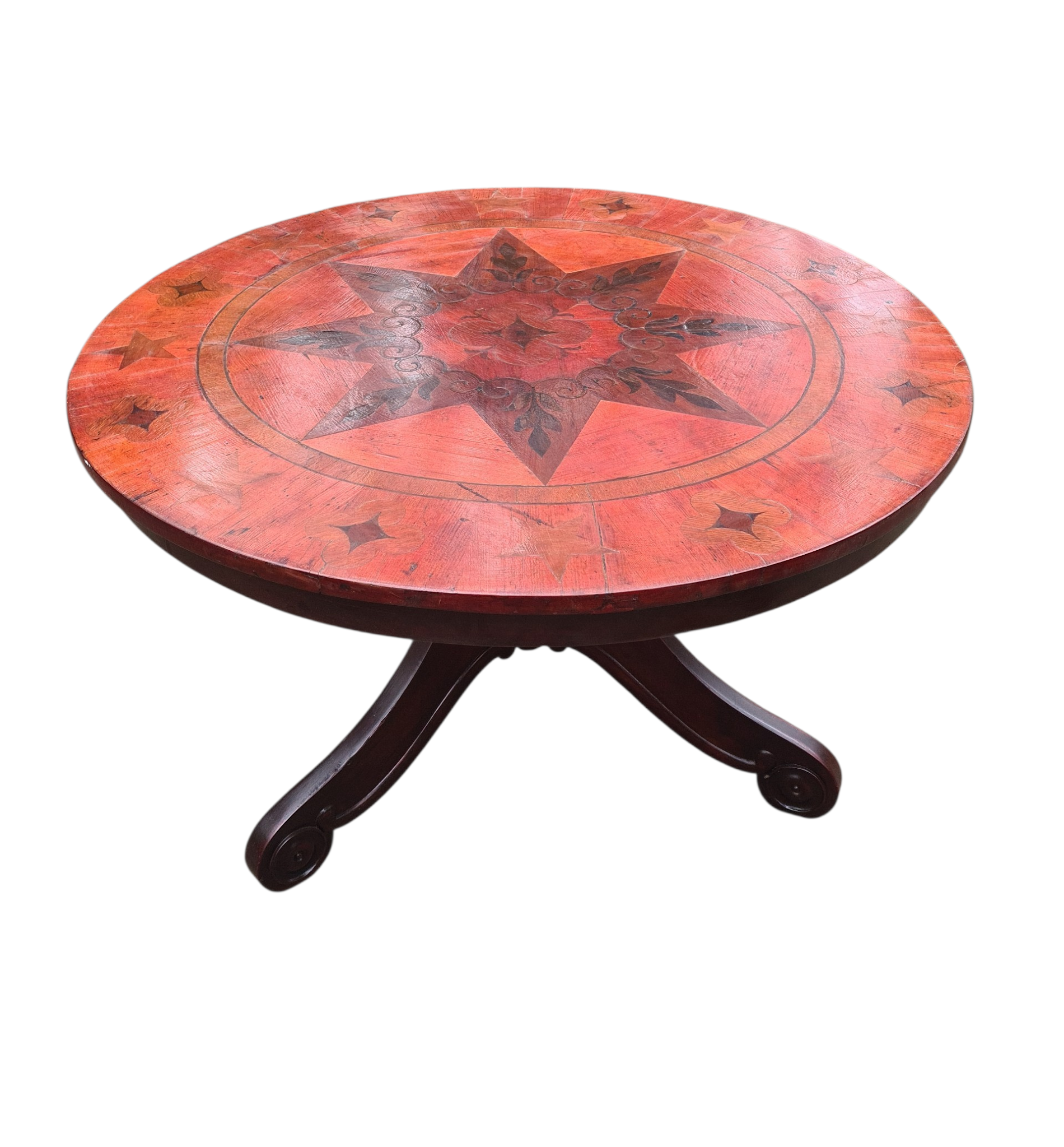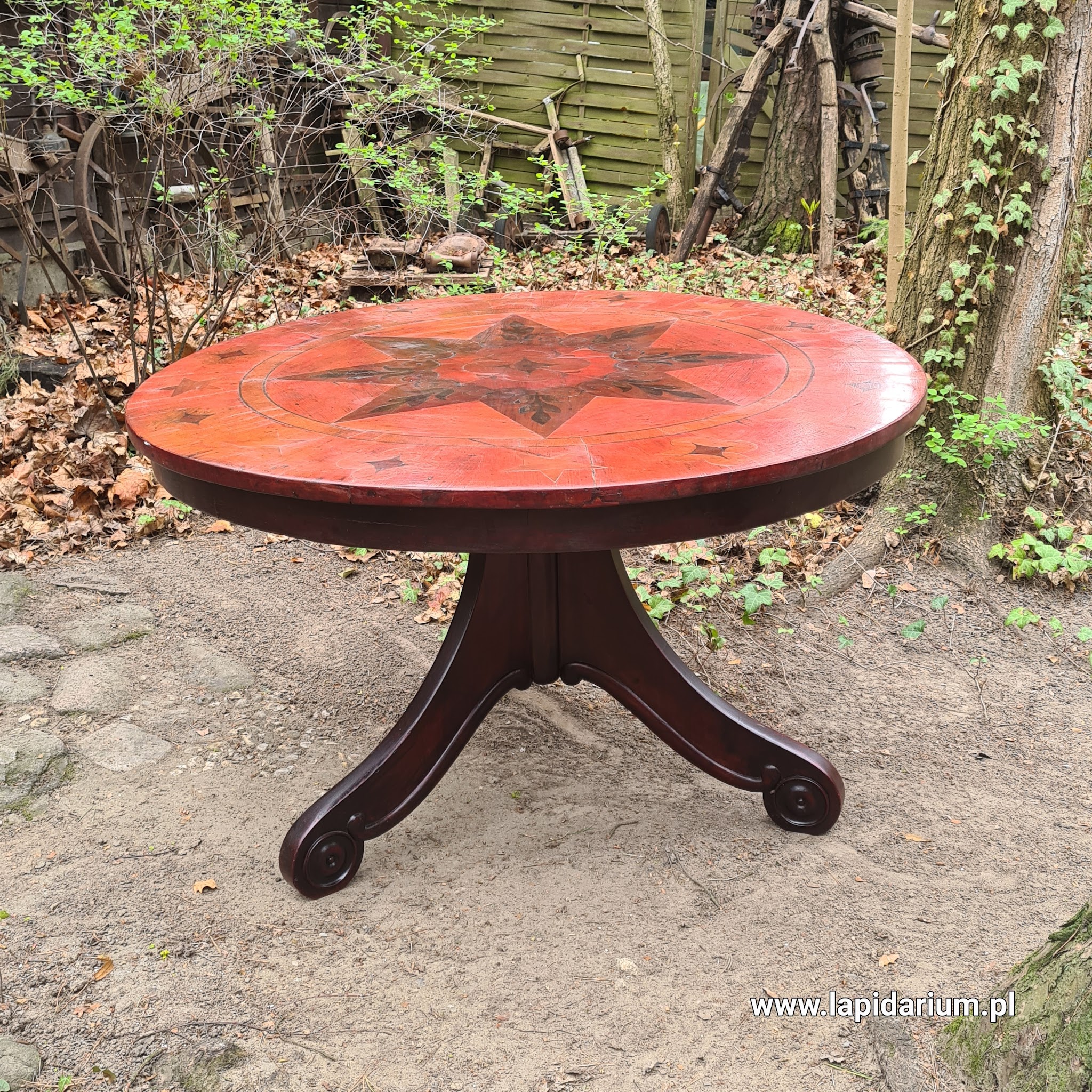 Autentyczny polski stół owalny z XVIII wieku, zdobiony misterną intarsją. Średnica blatu ok. 110 cm, wysokość ok. 70 cm. Unikatowy mebel kolekcjonerski.
