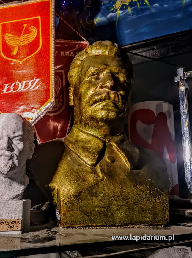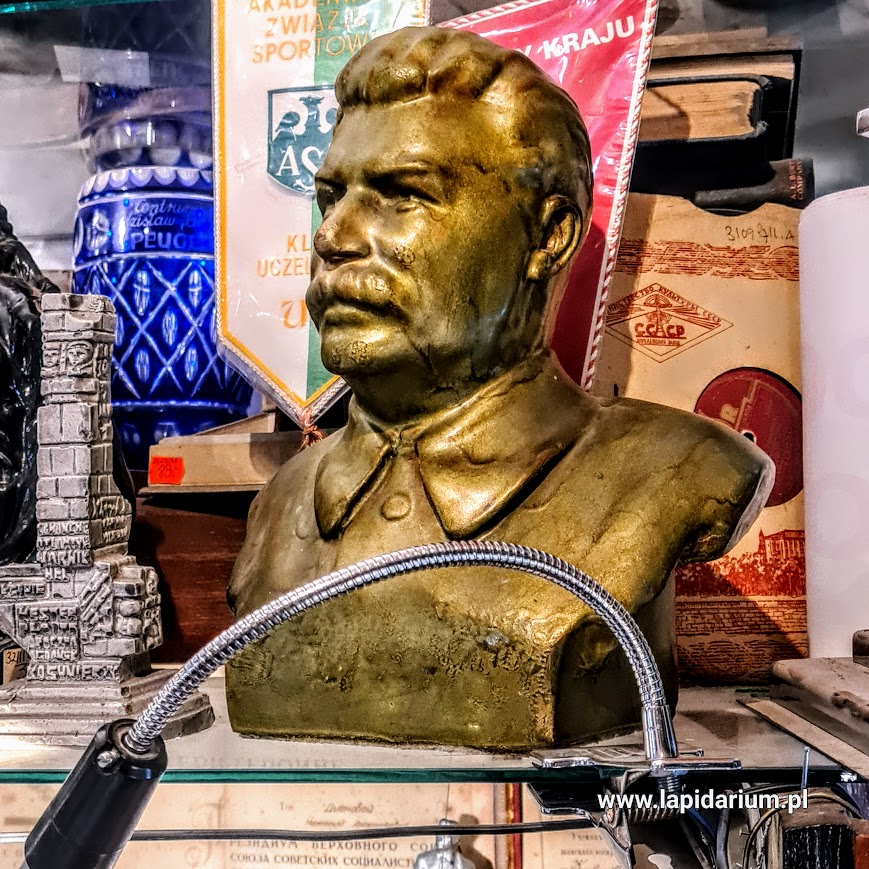 Popiersie Stalina wykonane ze sztucznego kamienia i pomalowane złoym lakierem. ZSRR. Wymiary:ok. 30 cm wysokości. Zachowany w dobrym stanie, brak ubytków i uszkodzeń.