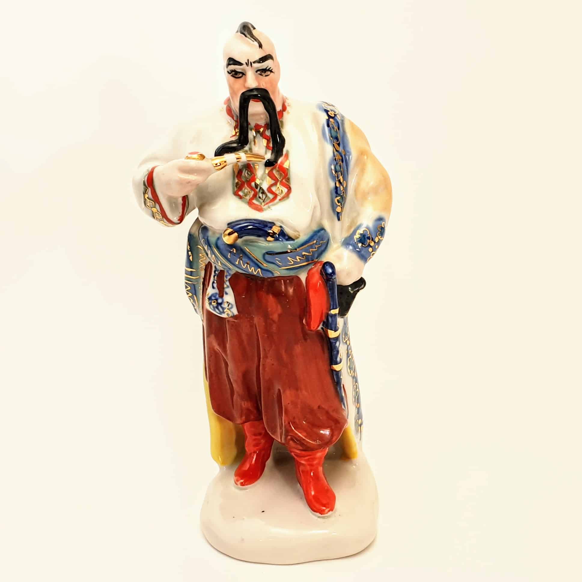 Porcelanowa figurka Kozaka Tarasa Bulby z fajką, ręcznie malowana, ZSRR/Połonne, lata 50-70. Wys. ok. 22-23 cm.