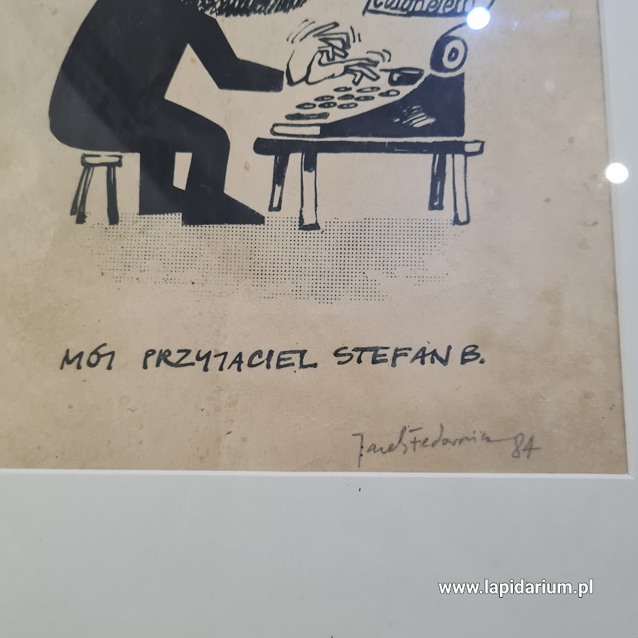 Wyjątkowy i osobisty rysunek autorstwa legendarnego Jacka Fedorowicza – satyryka, rysownika i współzałożyciela „Kabaretu Olgi Lipińskiej”. Praca pochodzi z 1984 roku i posiada niezwykle cenną, odręczną dedykację: „Mój przyjaciel Stefan”. Dzieło stanowi unikalne połączenie sztuki, historii polskiej kultury i prywatnej relacji dwóch wybitnych postaci.