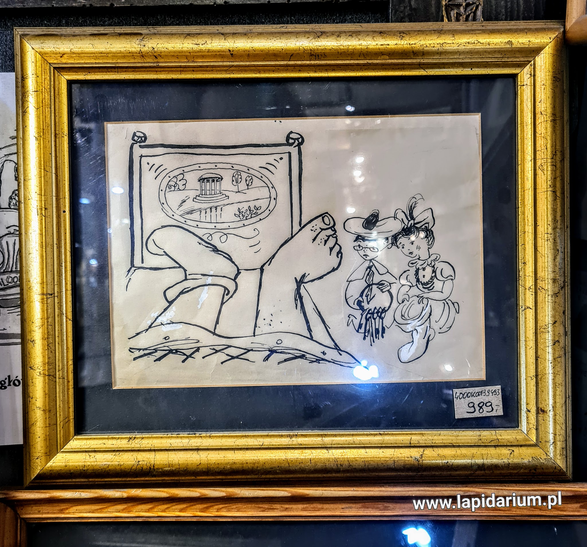 Oryginalny rysunek satyryczny Zbigniewa Lengrena z tygodnika „Szpilki” z lat 60. XX w., pochodzący z kolekcji W. Fillera. Oprawiony w drewniana ramę .