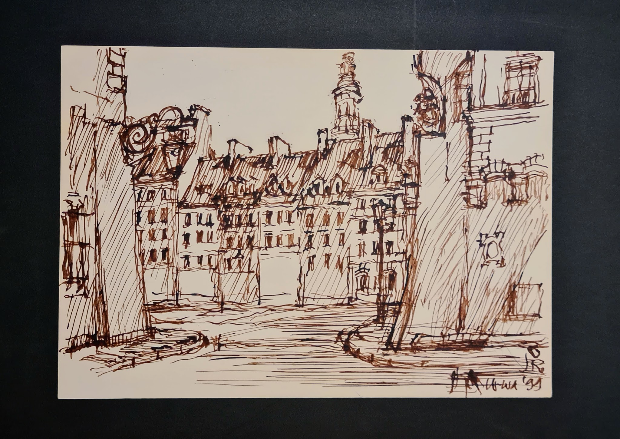 Oryginalny rysunek tuszem Ryszarda Natusiewicza, legendarnego nauczyciela pokoleń polskich architektów. Unikatowe dzieło sztuki i historii.