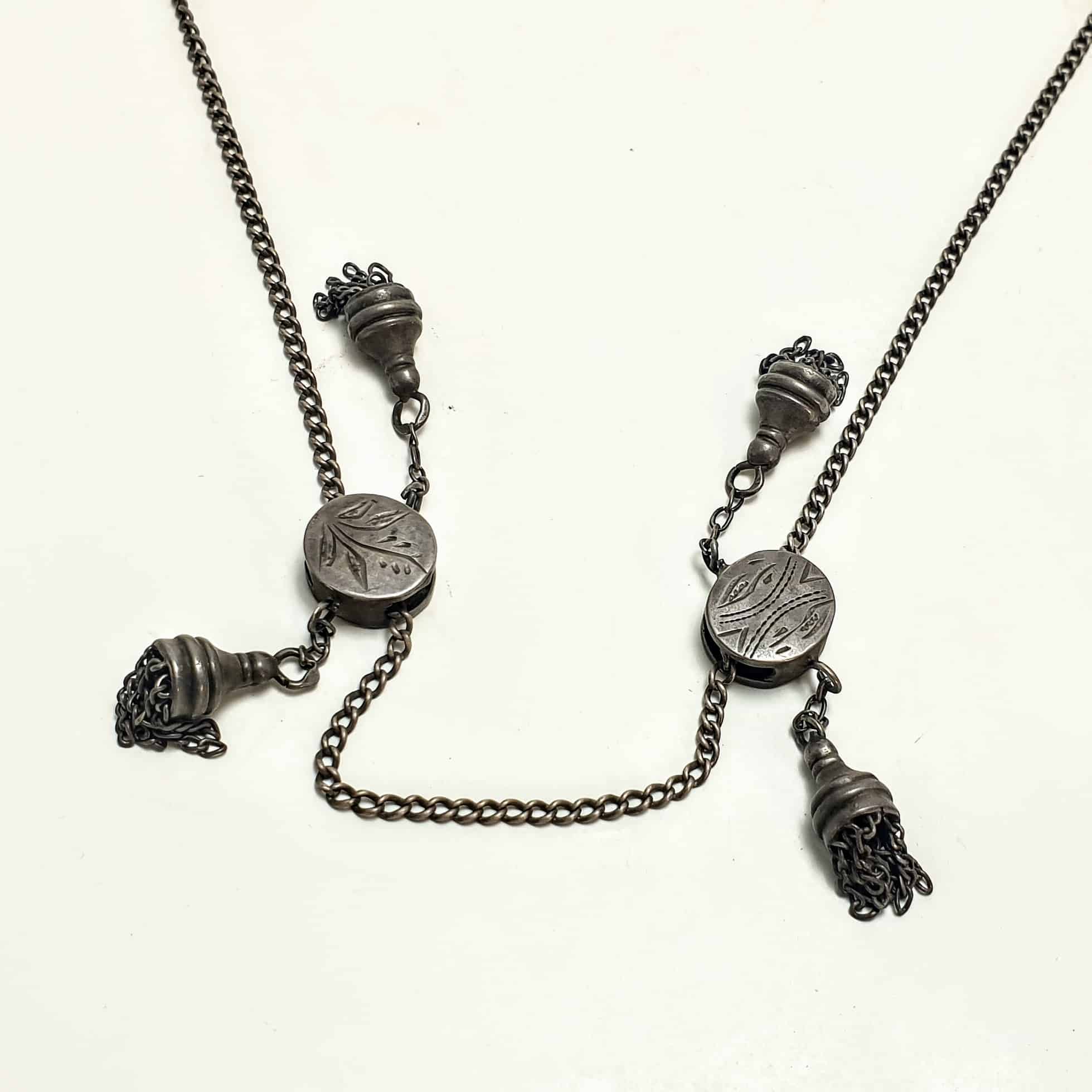 Autentyczny srebrny łańcuch żydowski z wisiorami w kształcie Tory z Polski XIX w. Stan kolekcjonerski, długość ok. 100 cm.
