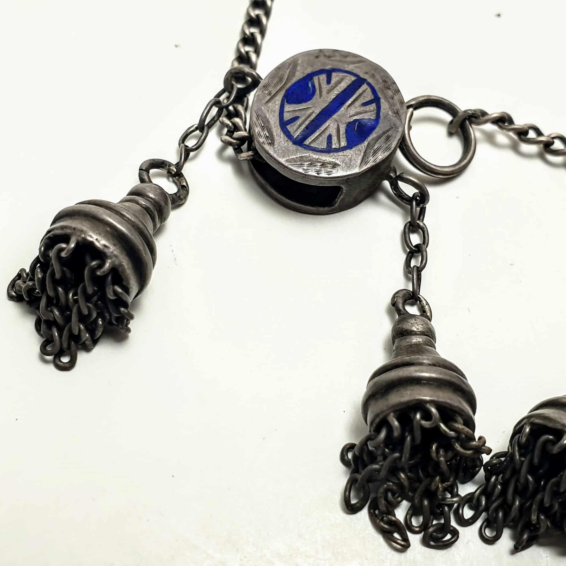 Łańcuch wykonany jest ze srebra, co świadczy o jego wartości i ceremonialnym przeznaczeniu. Każdy z wisiorów został precyzyjnie odlany i opracowany, co nadaje całości niepowtarzalny, elegancki charakter. Przedmiot zachował się w bardzo dobrym stanie kolekcjonerskim, bez znaczących uszkodzeń, co jest niezwykle cenne przy obiektach tej klasy i wieku. Widoczne są naturalne ślady patyny, potwierdzające autentyczność i wiek przedmiotu.