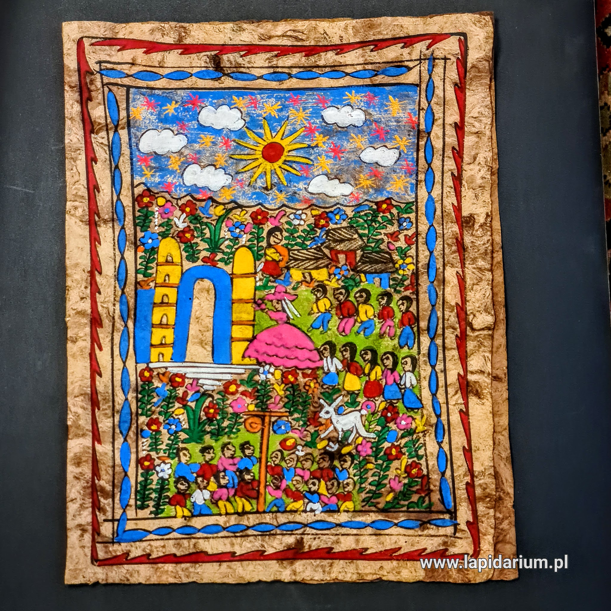 Autentyczny, ręcznie malowany obraz na korze amate z Meksyku, przedstawiający barwną scenę ludową. Unikatowy obiekt sztuki i rękodzieła.