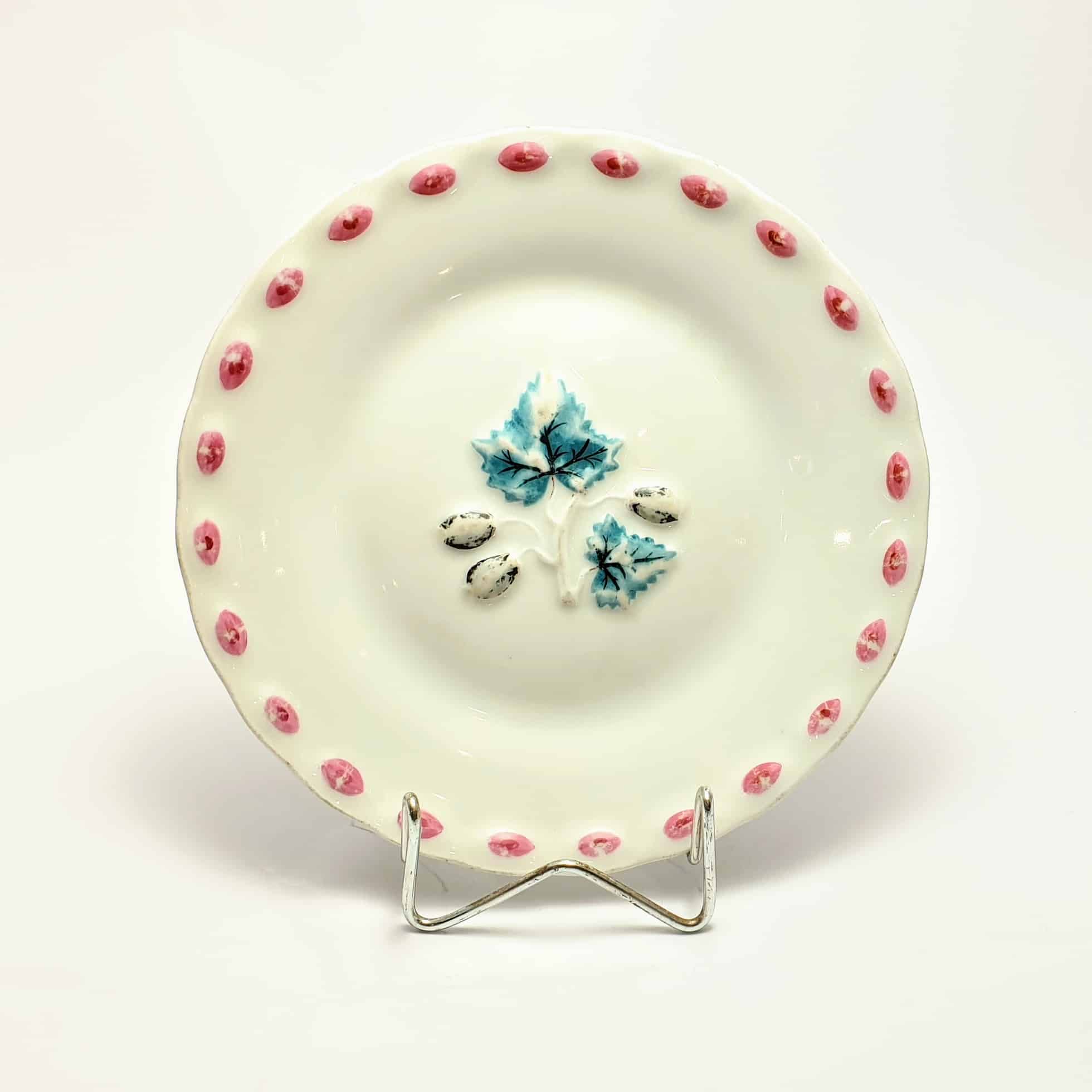 Talerz wykonany jest z najwyższej jakości, białej porcelany, słynącej z kremowej barwy i doskonałej przezierności. Charakteryzuje go klasyczne, okrągłe uformowanie z delikatnie podniesionym rantem. Na powierzchni widnieje ręcznie malowana, roślina dekoracja w stonowanych, pastelowych barwach, typowa dla estetyki biedermeieru lub późniejszego historyzmu, z dominującą bordiurą w kolorze intensywnego błękitu pruskiego.