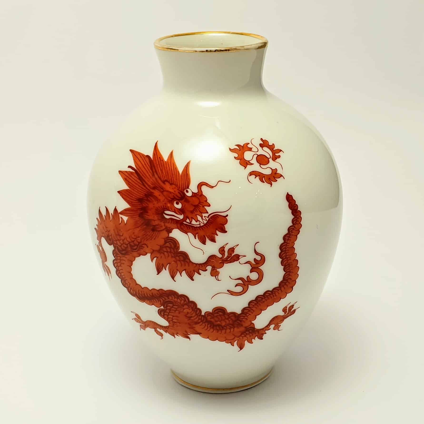 Oryginalny wazon z miśnieńskiej porcelany Meissen z ręcznie malowanym czerwonym smokiem – wyjątkowy przedmiot kolekcjonerski.