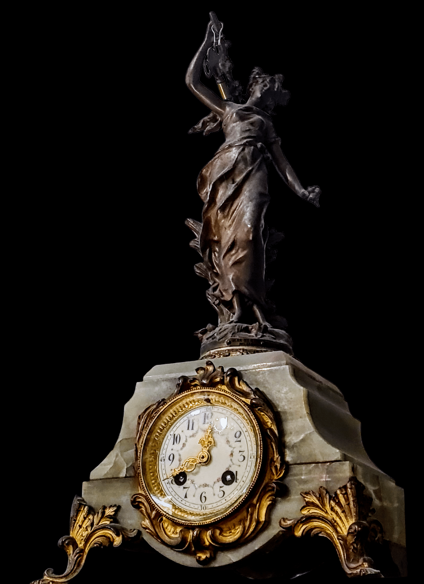 Przed Państwem wyjątkowy, zabytkowy zegar kominkowy, który jest nie tylko precyzyjnym urządzeniem do mierzenia czasu, ale także prawdziwym dziełem sztuki zdobniczej. Centralnym punktem tego eleganckiego czasomierza jest pełna dynamizmu figura skrzydlatej Nike – greckiej bogini zwycięstwa, przedstawionej w walecznej pozie z uniesionym mieczem. Ten motyw, sięgający starożytności, był niezwykle popularny w sztuce XIX wieku, symbolizując chwałę, triumf i nieśmiertelność.