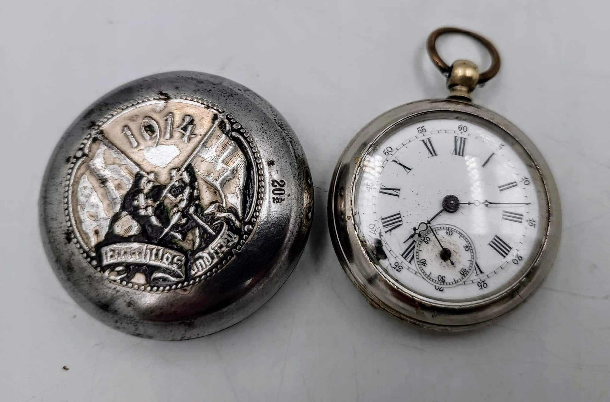 Zestaw kolekcjonerski: szwajcarski zegarek kieszonkowy wymagający czyszczenia oraz oryginalne pudełko kombatanta Wehrmacht z 1914 roku.